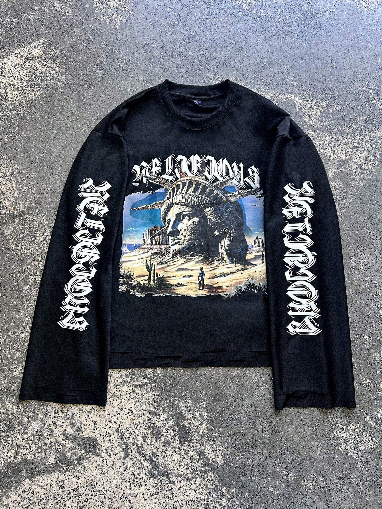 تي شيرت رجالي بياقة مستديرة وطباعة شخصية الشارع مع تأثير تمزق الأكمام الطويلة