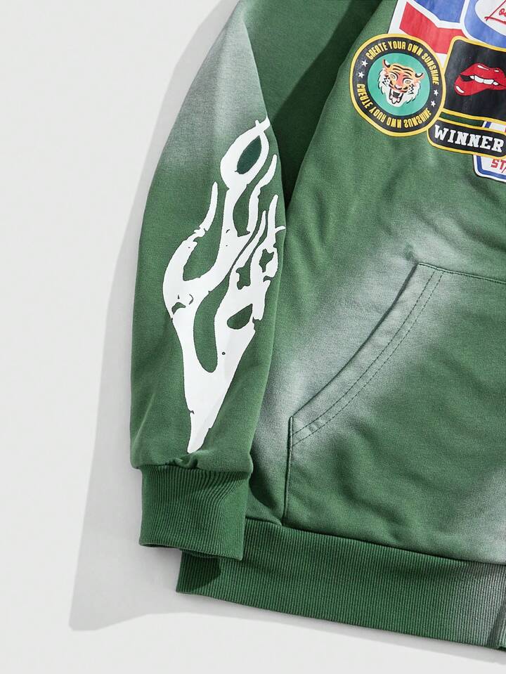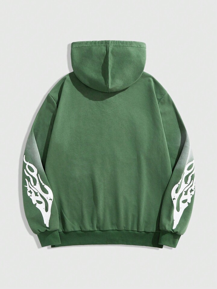 هودي كاجول بأكمام طويلة مزين بطباعة حرفية، سوستة أمامية وجيوب، أسلوب بسيط للرجال