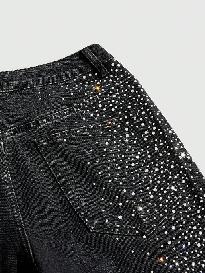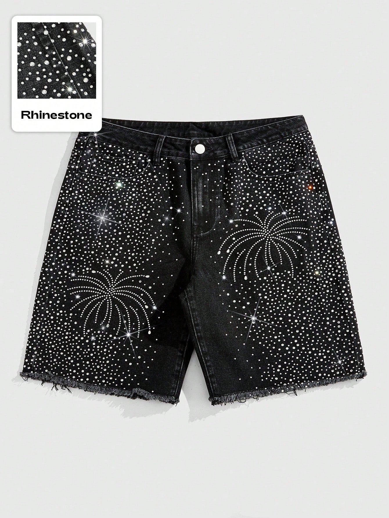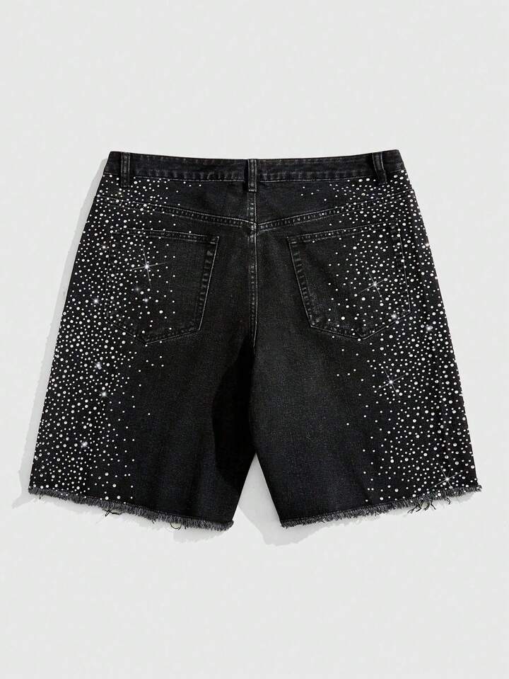 Street Life بنطلون جينز قصير عادي مرصع بالكريستال مع حافة مبتورة للرجال