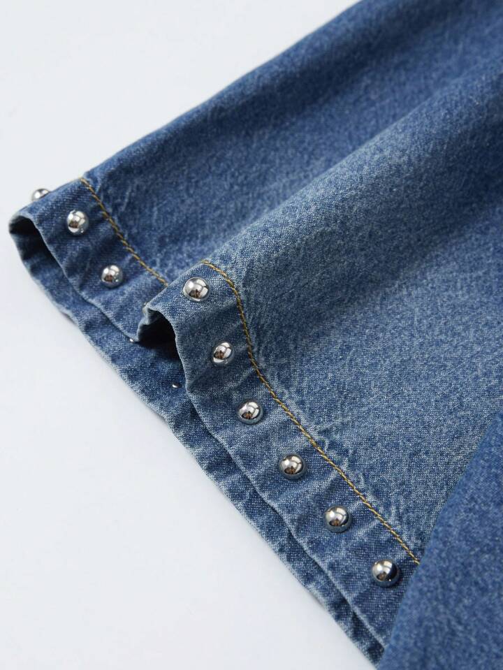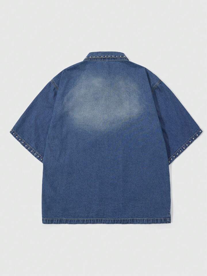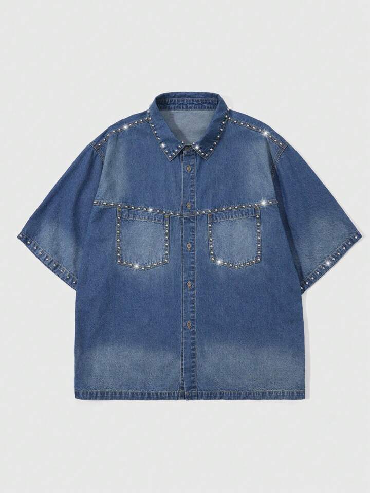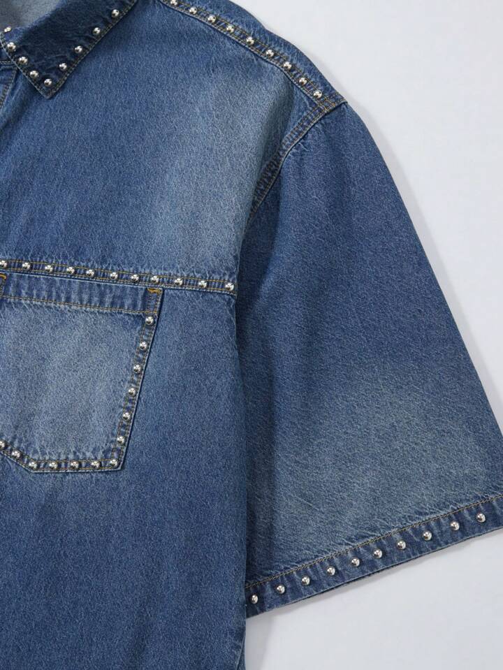 Street Life قميص جينز رجالي أحادي الصدر مزين بالخرز الأبيض، مناسب للصيف