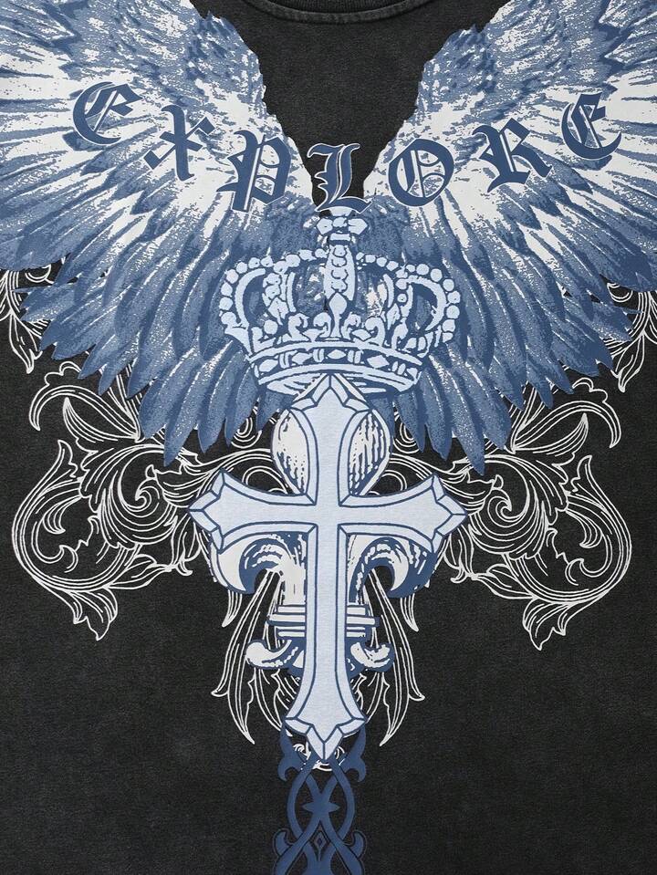 Goth تي شيرت قصير الأكمام مطبوع بطباعة جوتيك مغسول بطريقة عتيقة للرجال، صيفي