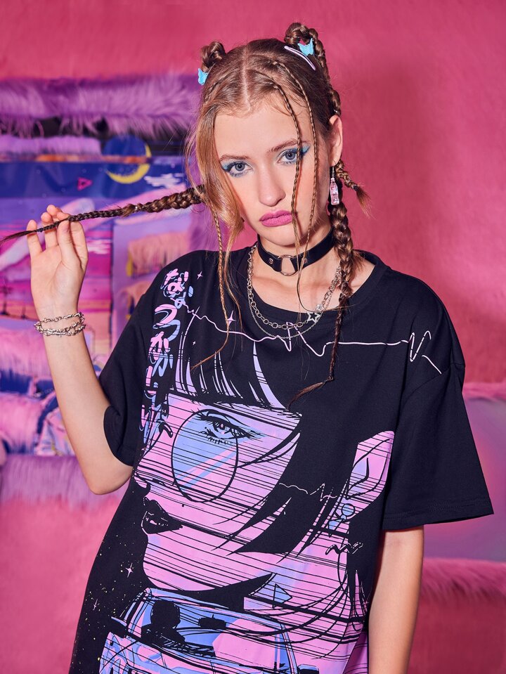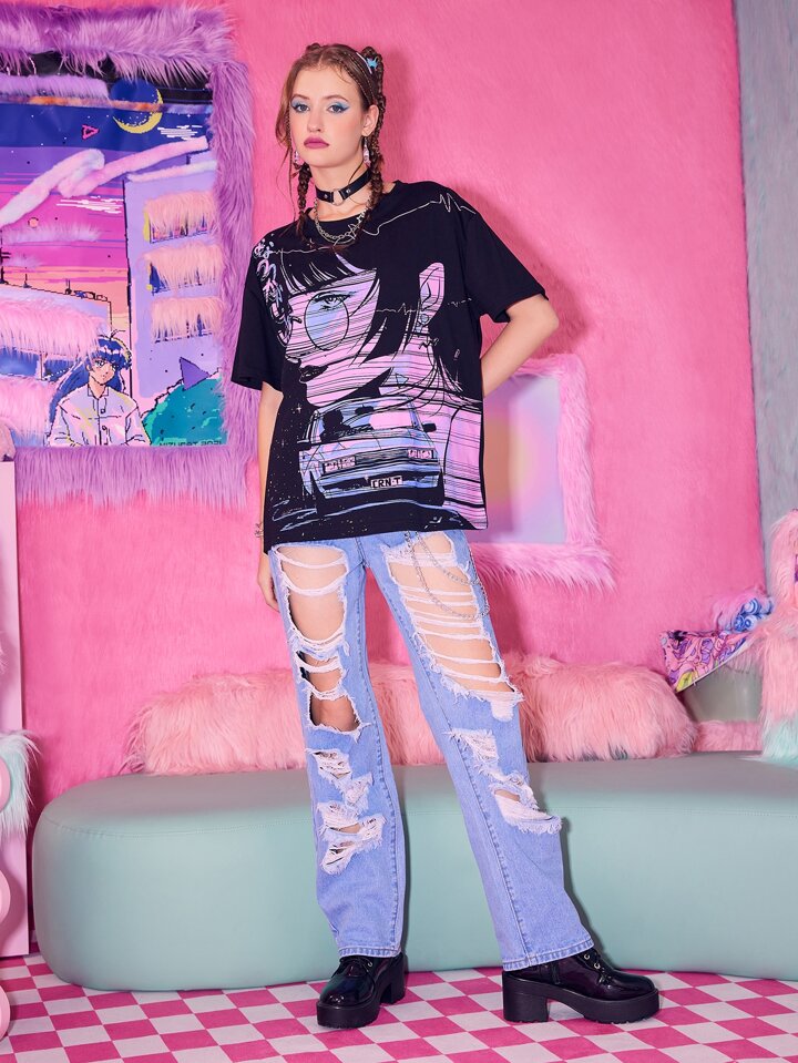 Mizucat تي شيرت حجم كبير بجرافيك سيارة وشخصية انيميلوف