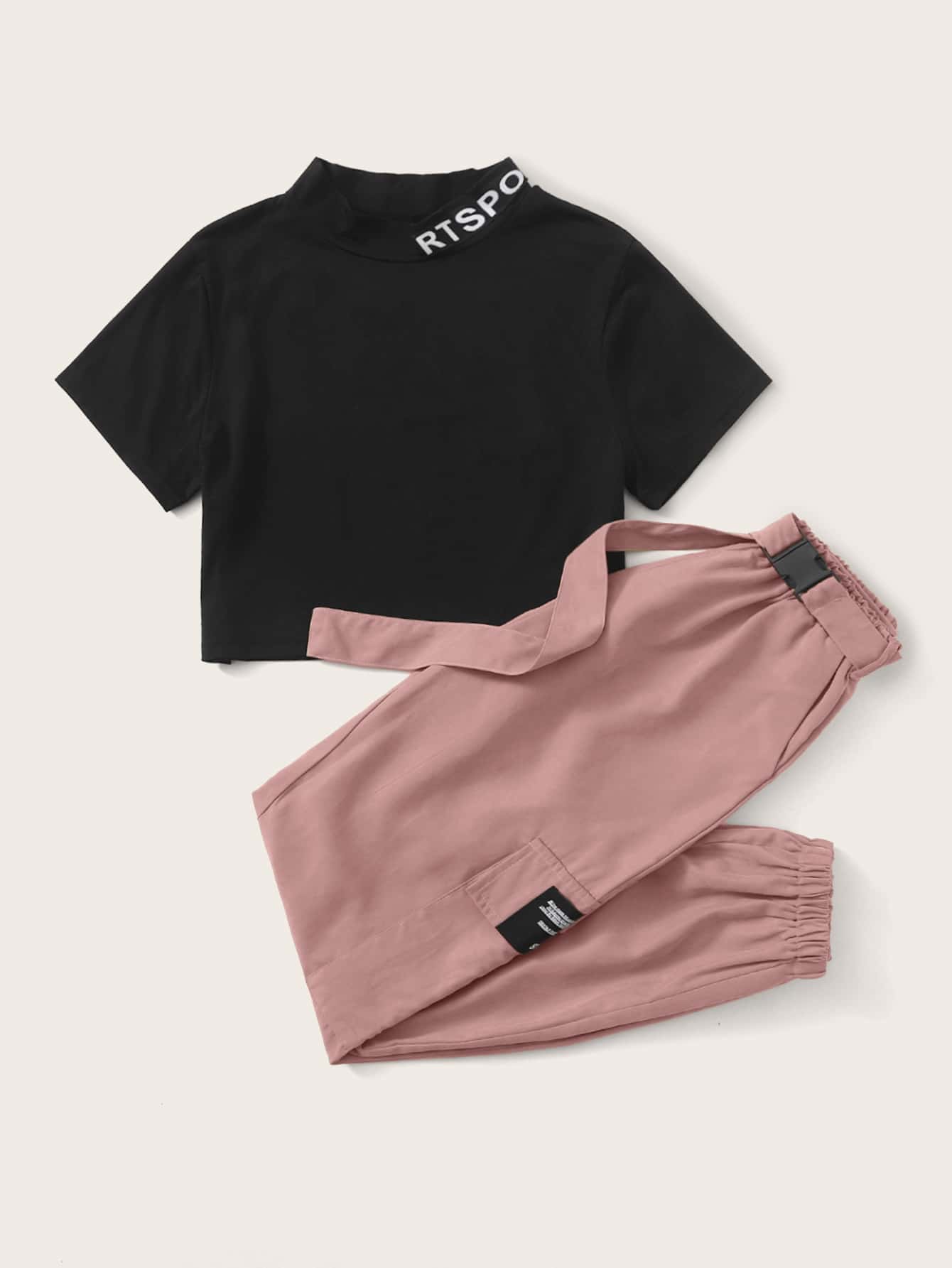 سروال كراجو بحزام مع تي شيرت بعنق دائري