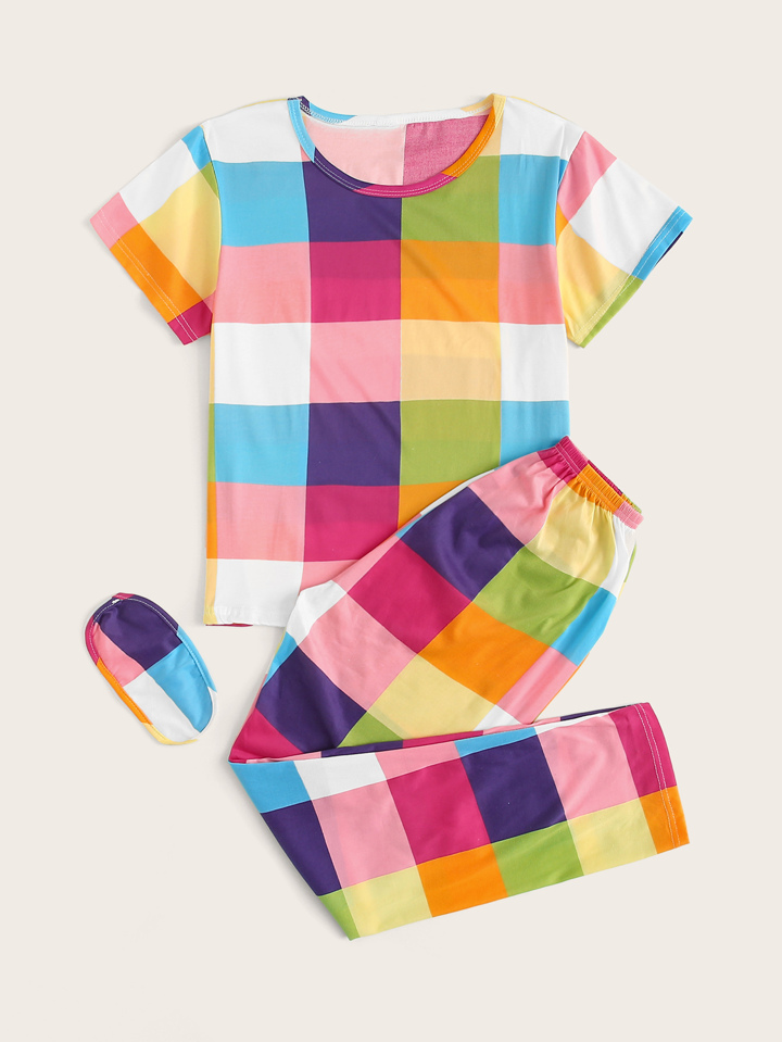 طقم بيجامة بكاروهات متعددة الألوان مع قناع عين