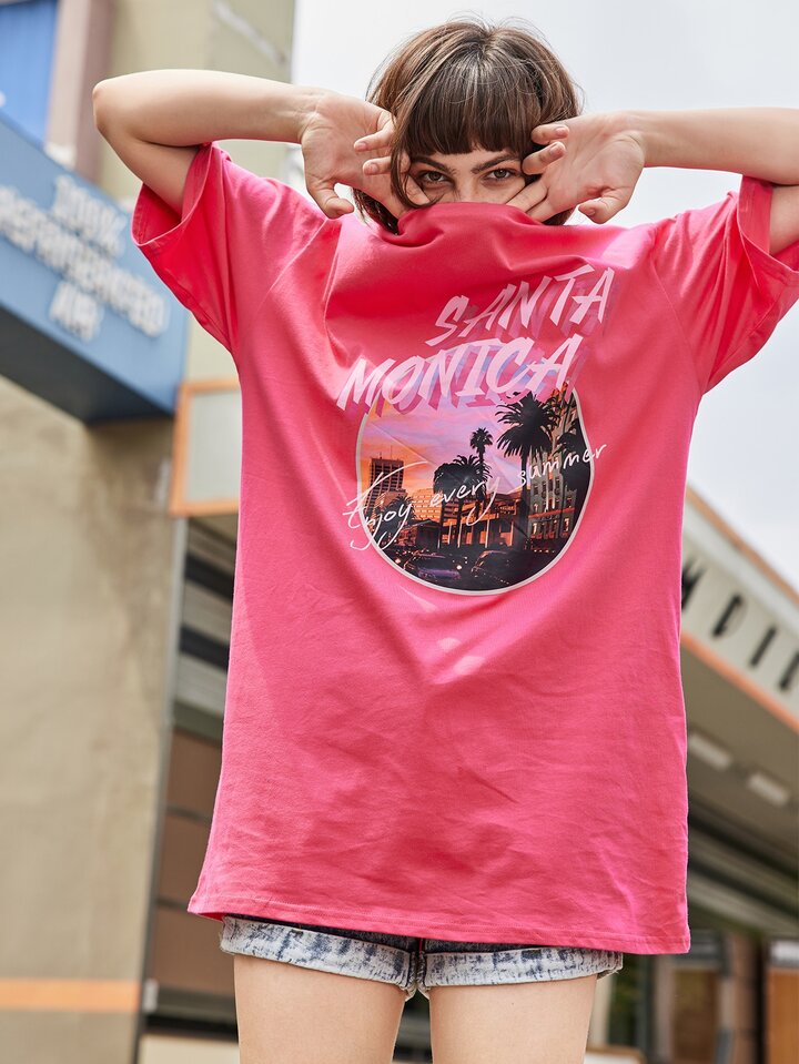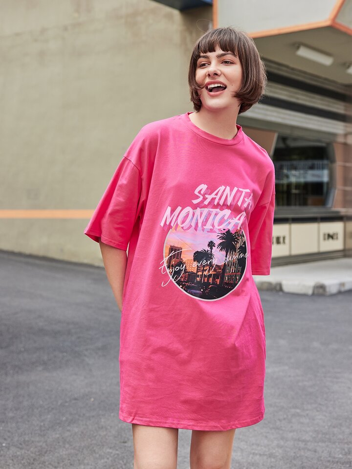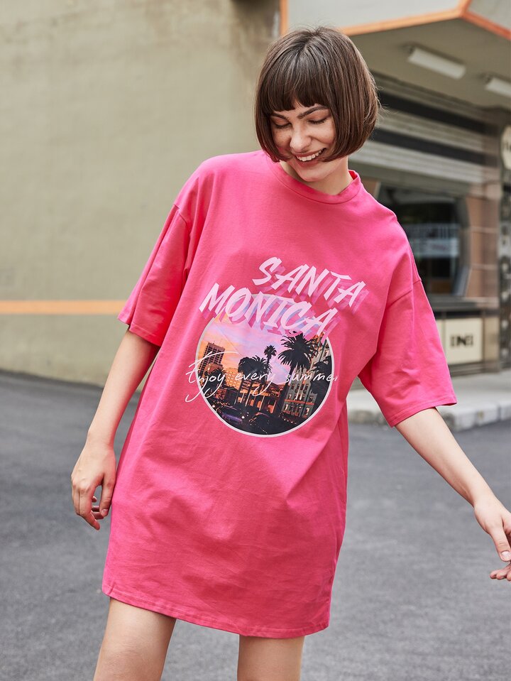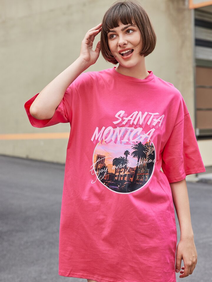 فستان تي شيرت منخفض الاكتاف بطباعة استوائي وعبارة بلون النيون وردي