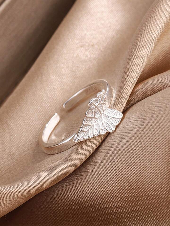خاتم على شكل ورقة قيقب الغابة على الطراز الكوري الجديد للنساء، بتصميم واضح، نهاية مفتوحة، تصميم قلب وورقة باللون الفضي