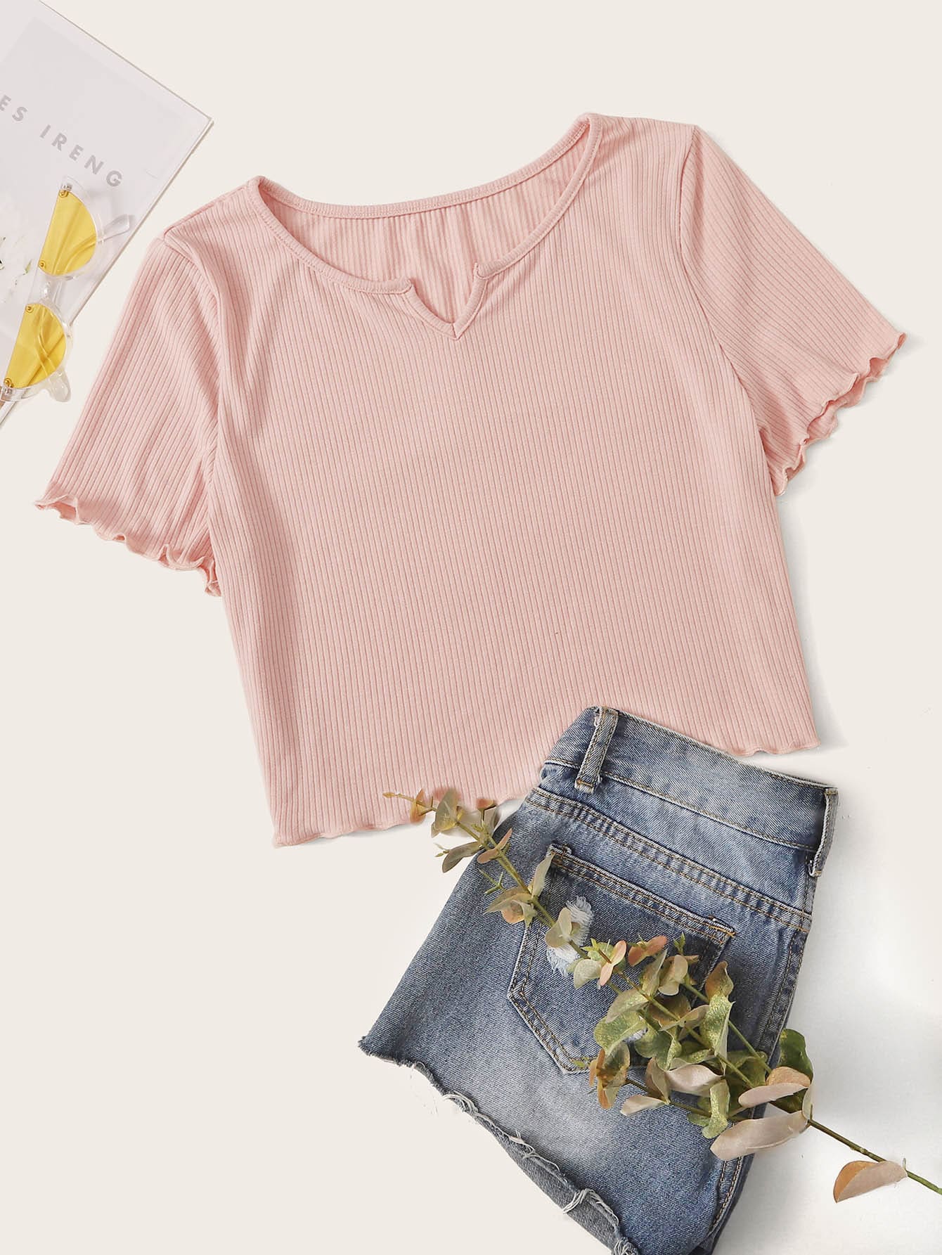 تي شيرت وردي مقلم نمط الخس وبياقة مسنن