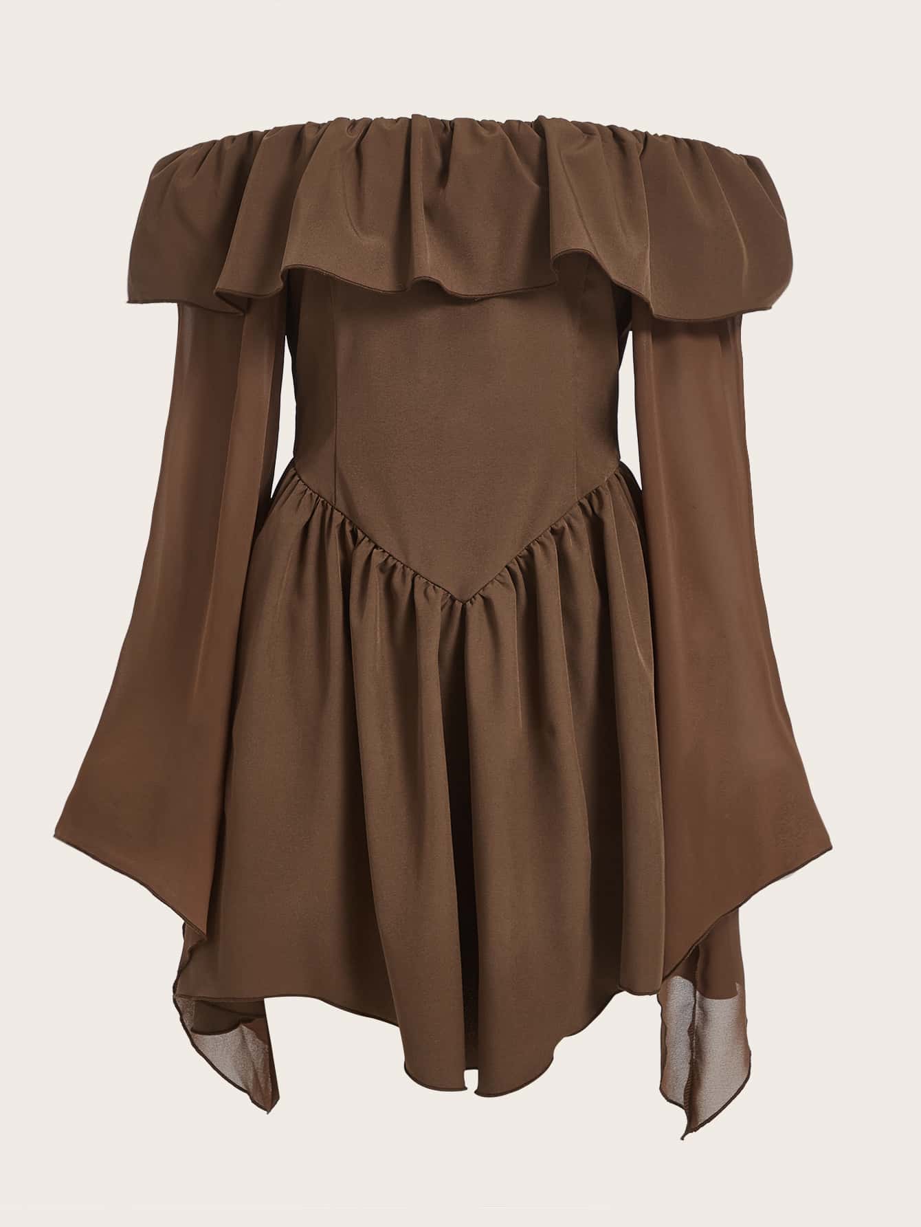 فستان مكشوف الكتف مقلم بكشكش اكمام منتفضة