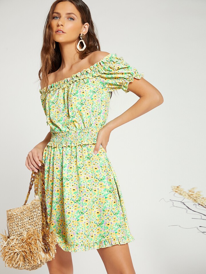 فستان بزهر اقحوان مقلم بهدب وبخصر مدرز مكشوف الكتف