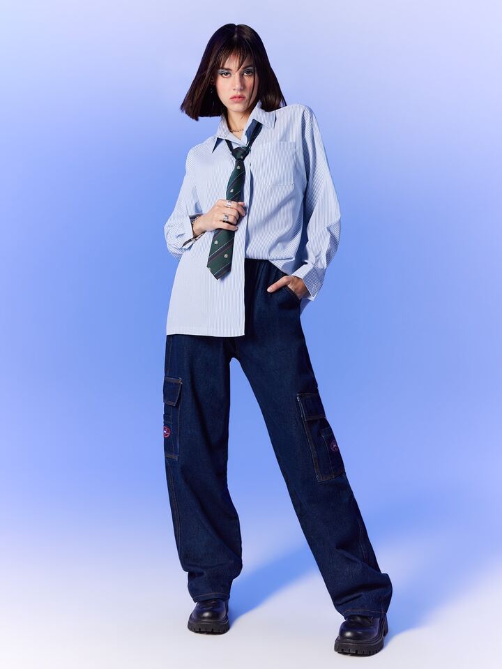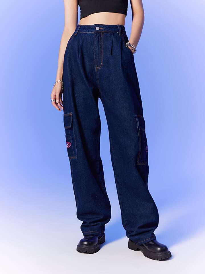 بنطلون جينز بتفاصيل مرقع جيب قلاب ساق عريضة