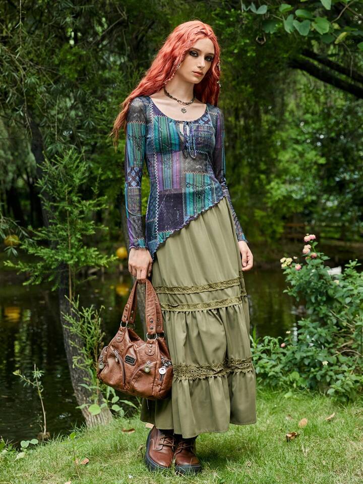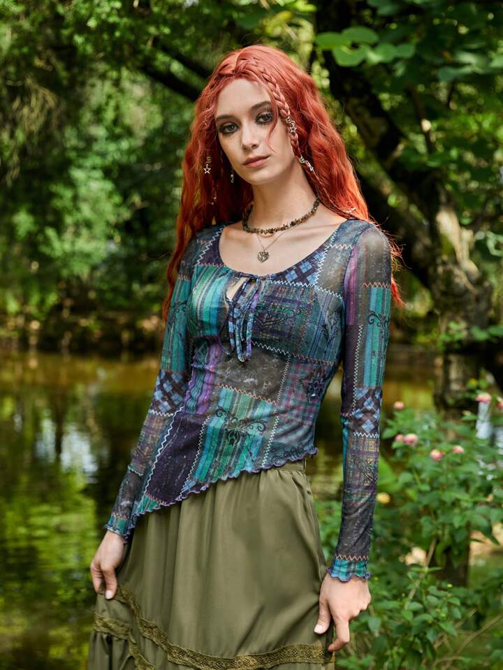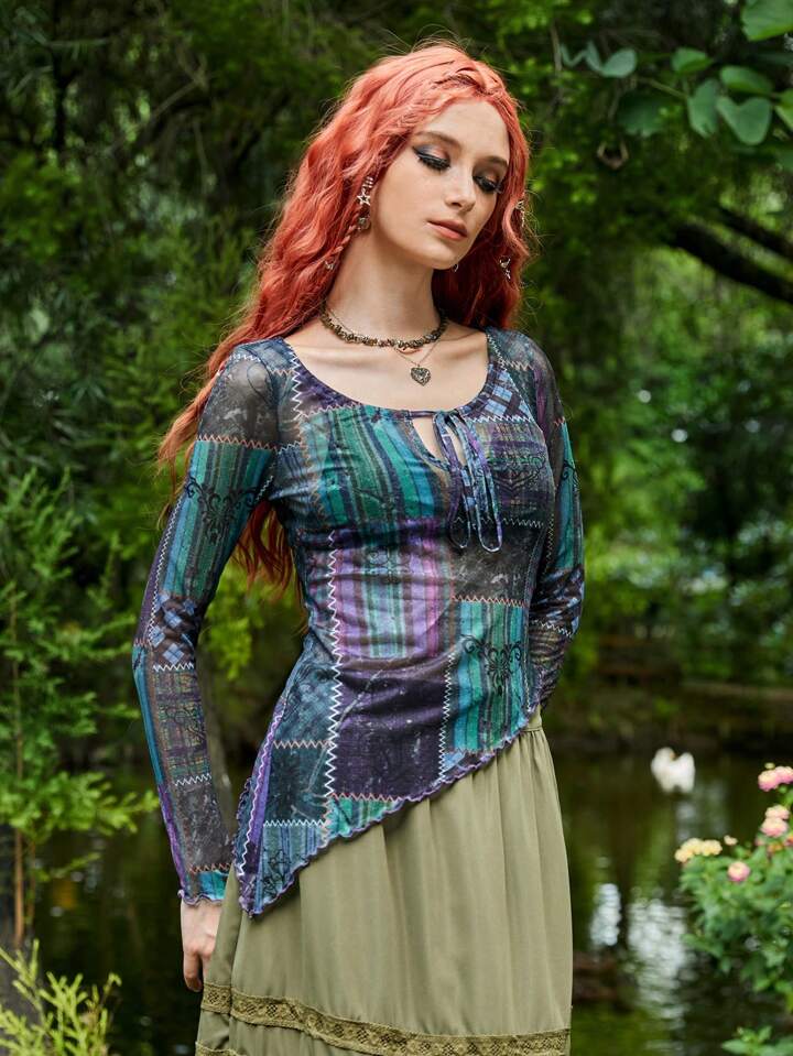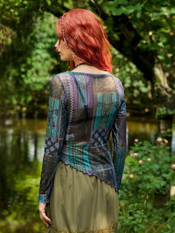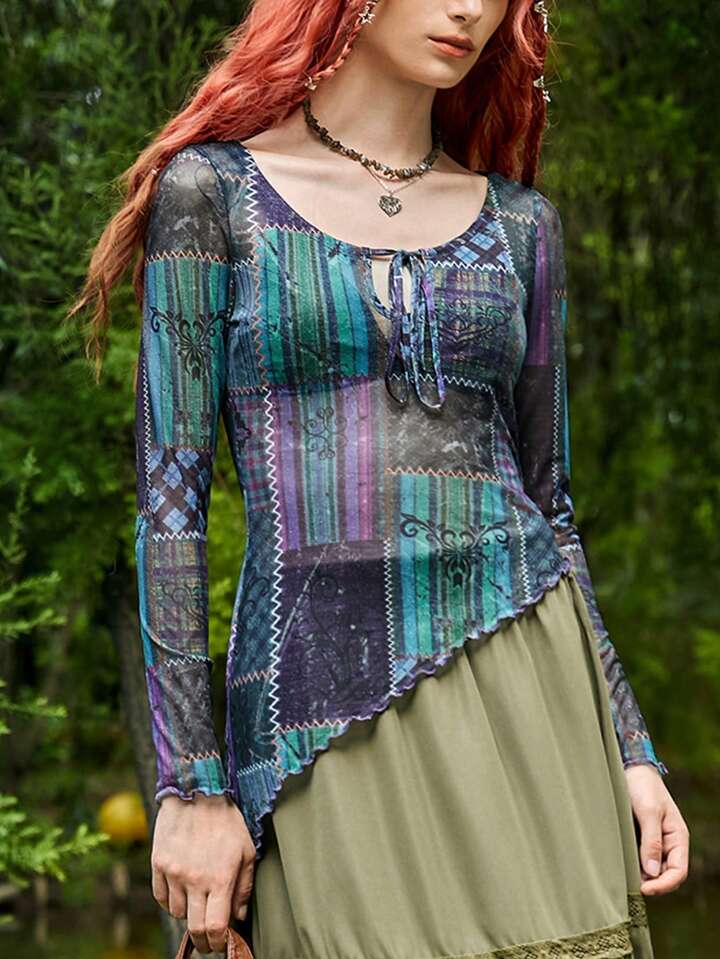 لباس علوي طباعة مختلط ربطة امامية مقلم نمط نبات الخس شبكة بدون حمالة صدر