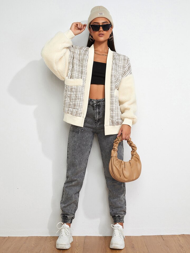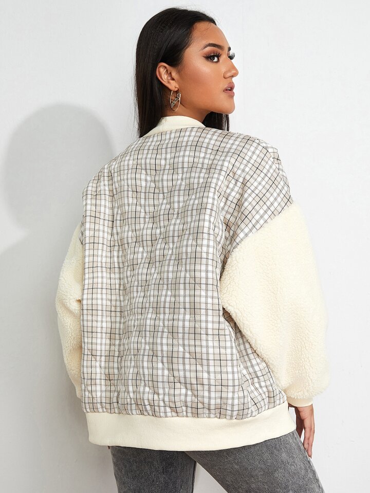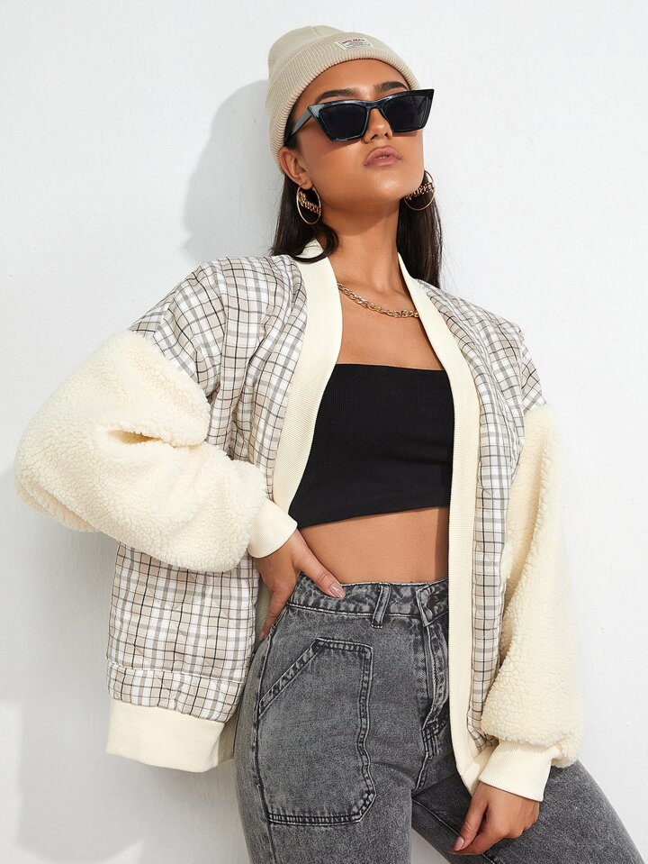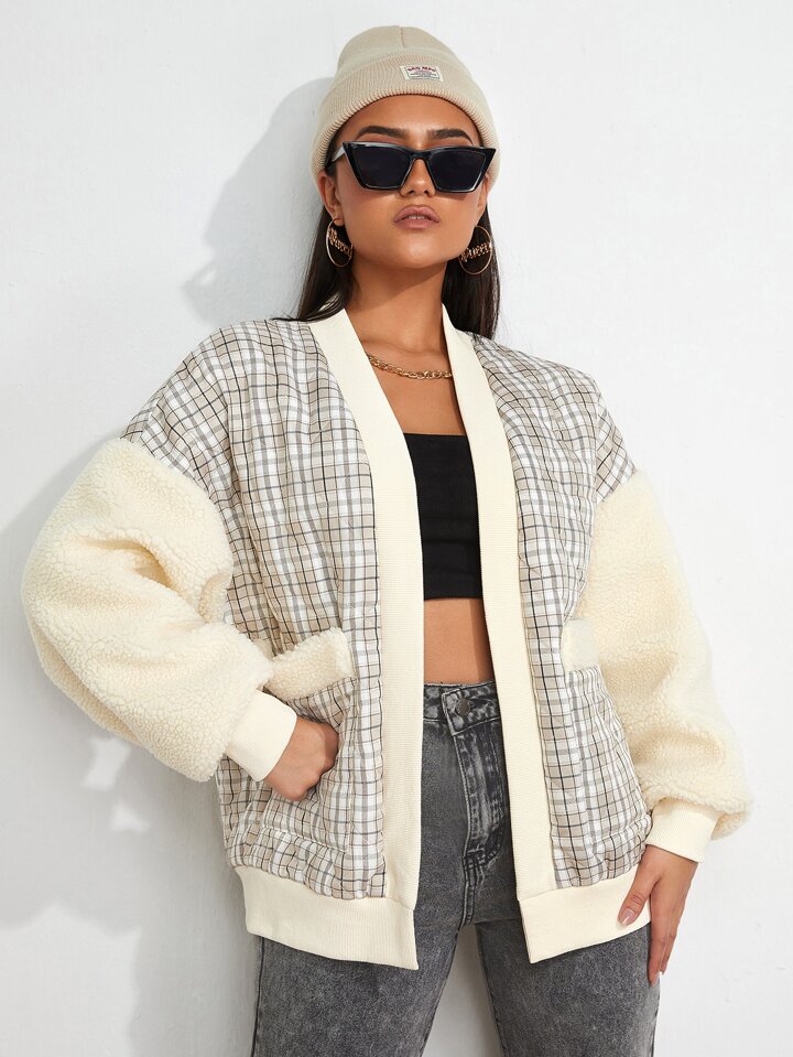 جاكيتات تيدي طباعة مربع النقش منخفض الاكتاف مفتوح امامي