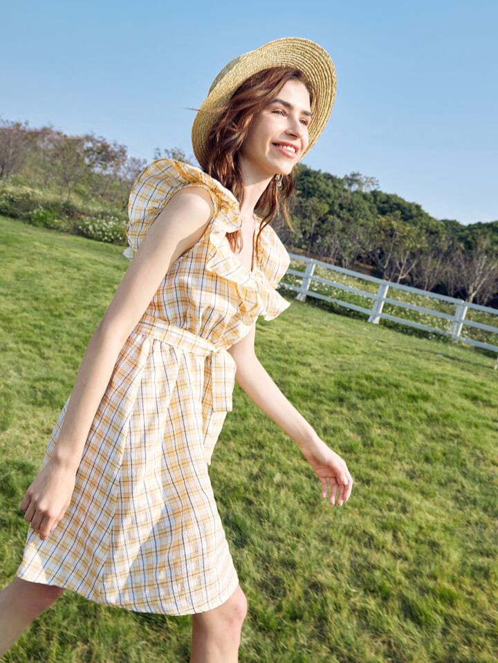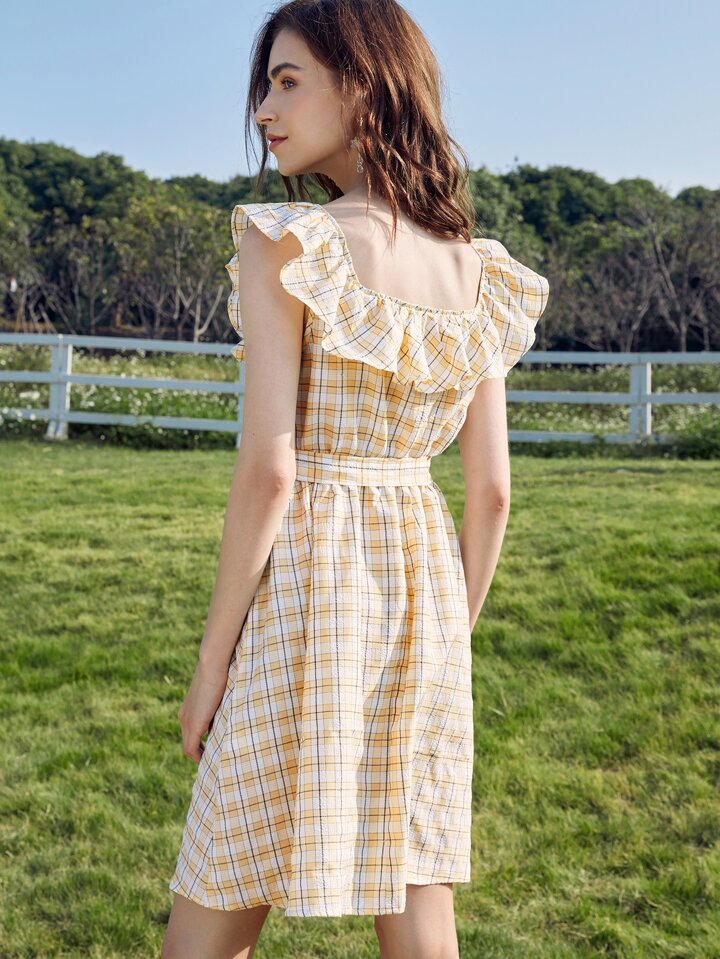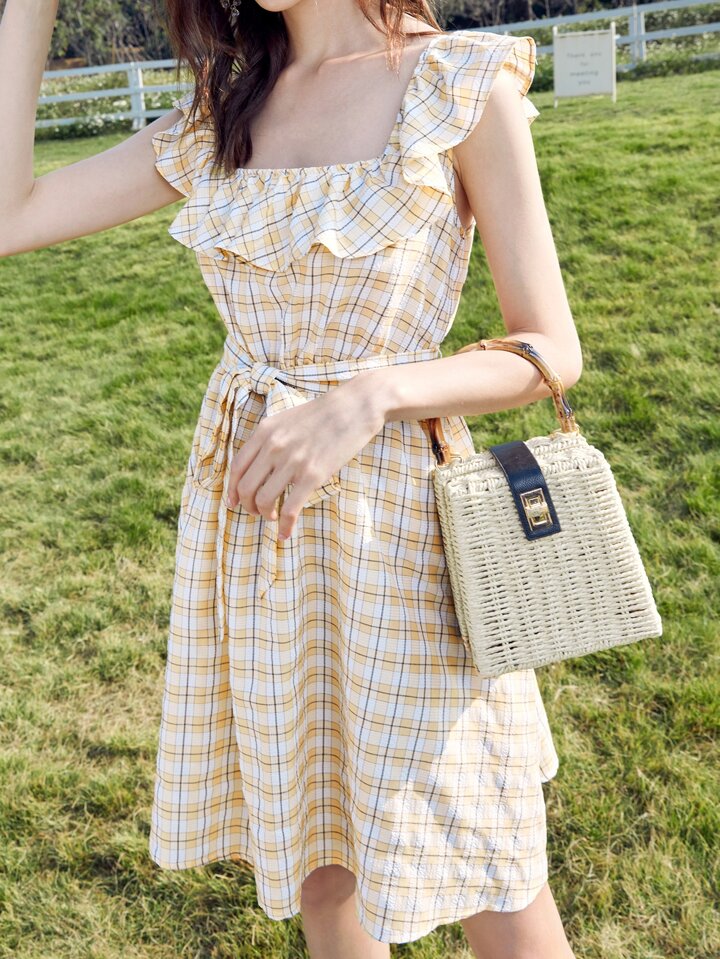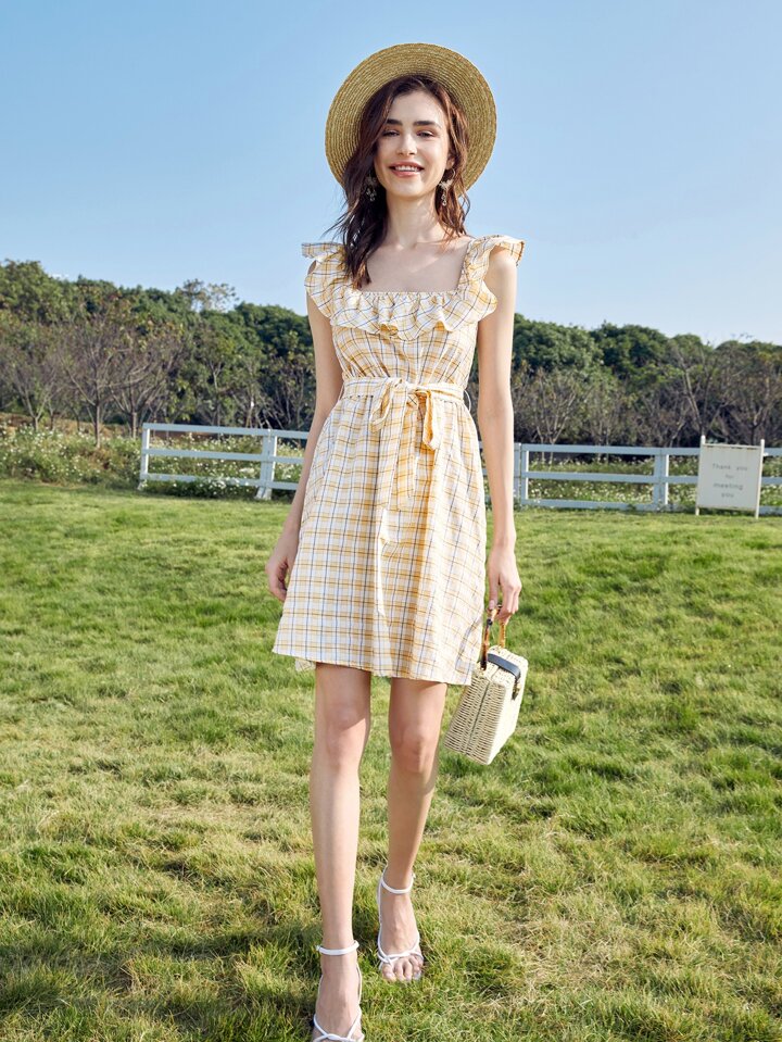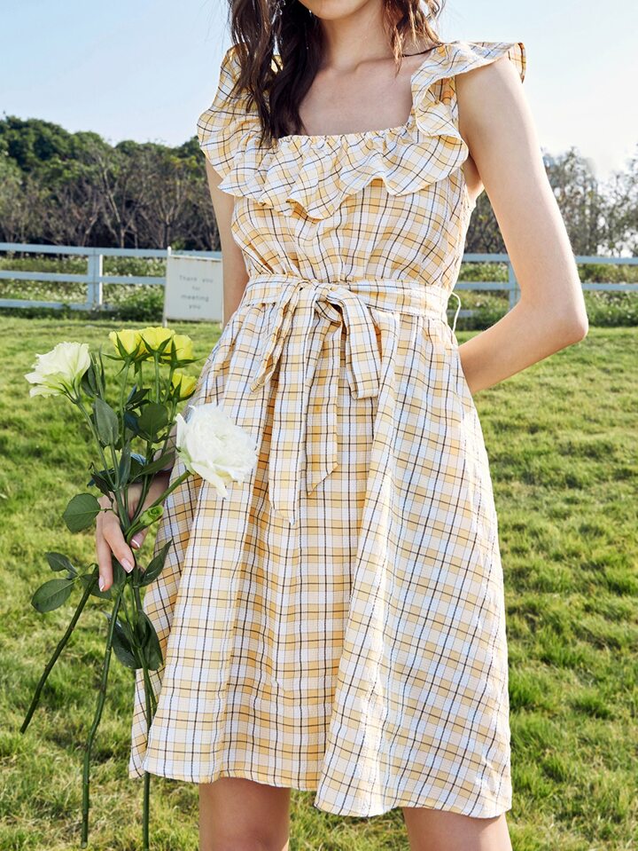 فستان بحزام مربعات ملونة مقلم بكشكش