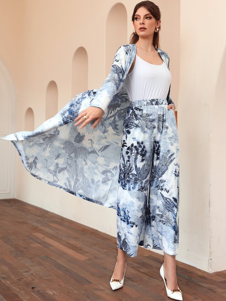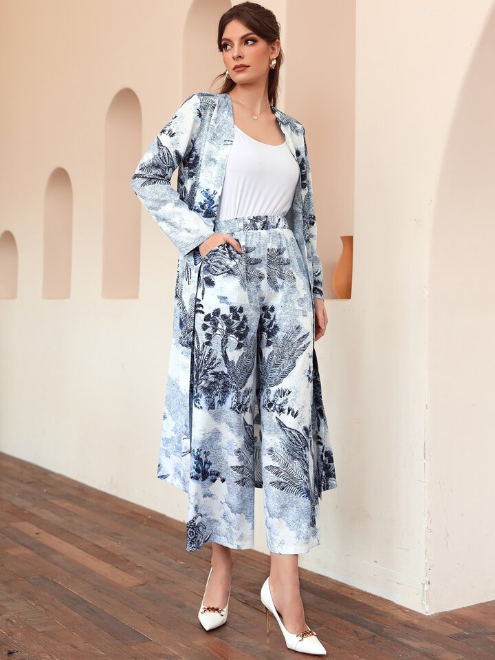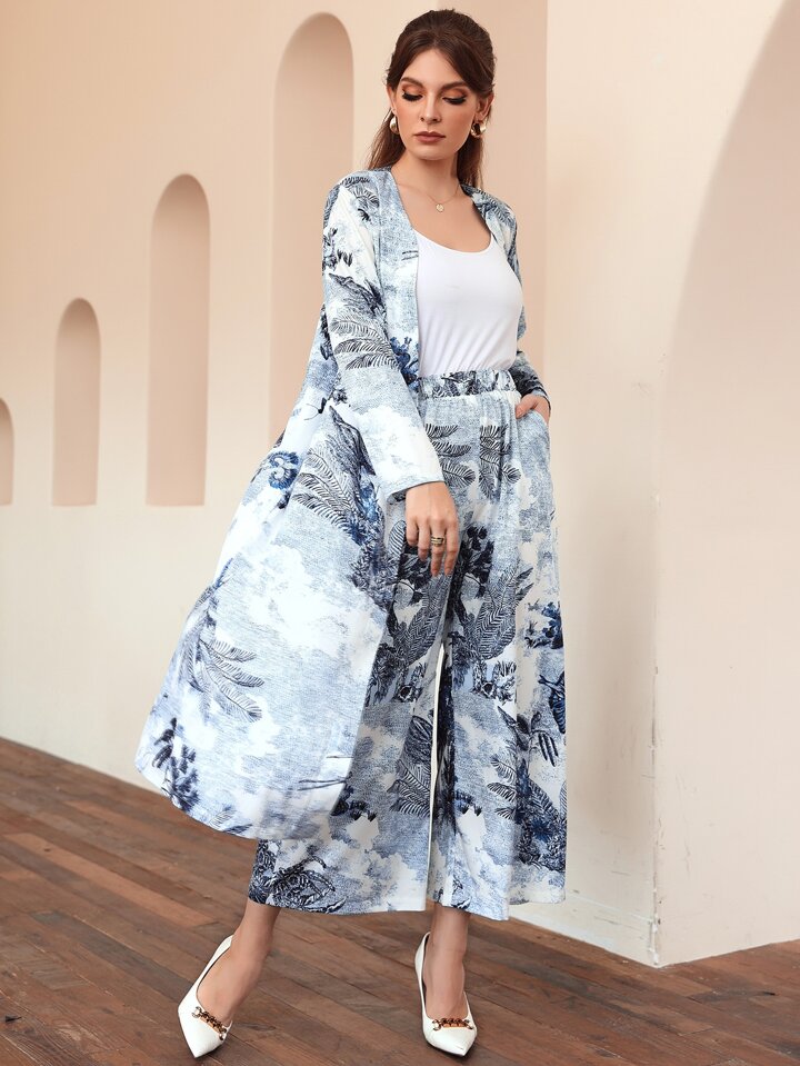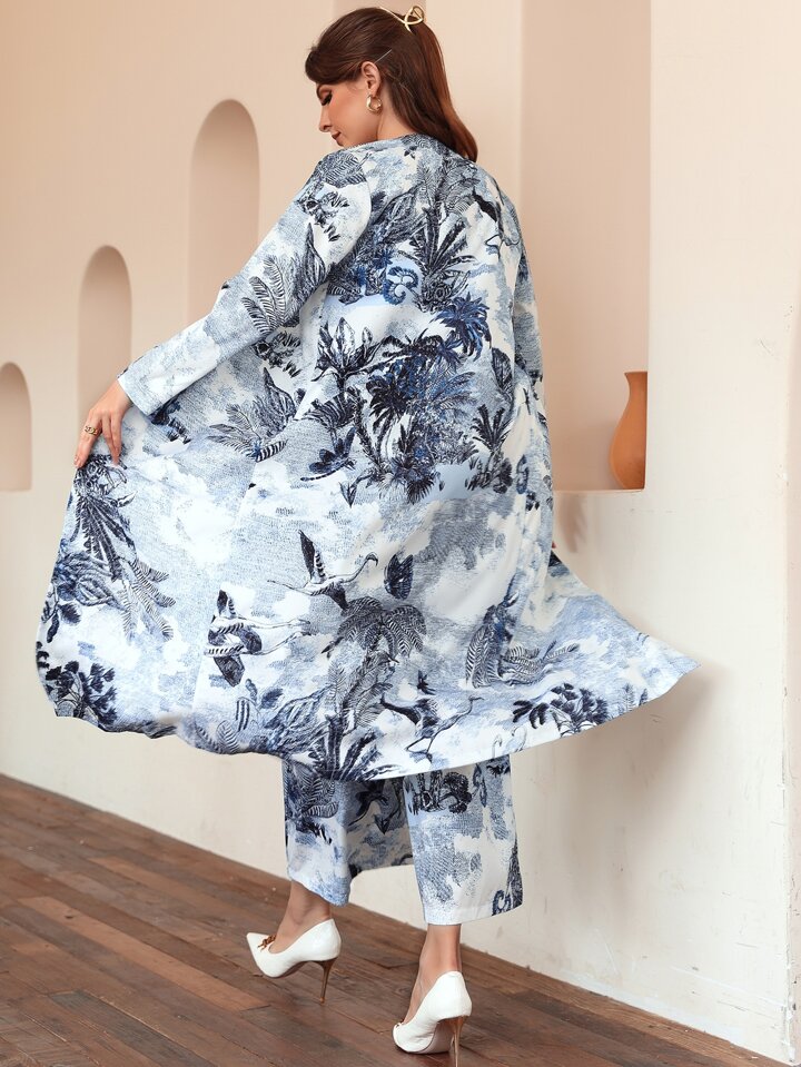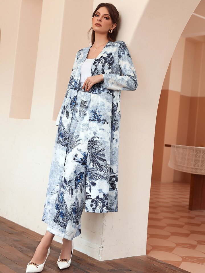 معطف مفتوح من الأمام بطباعة نبات وبنطلون