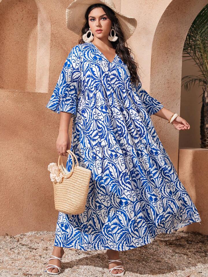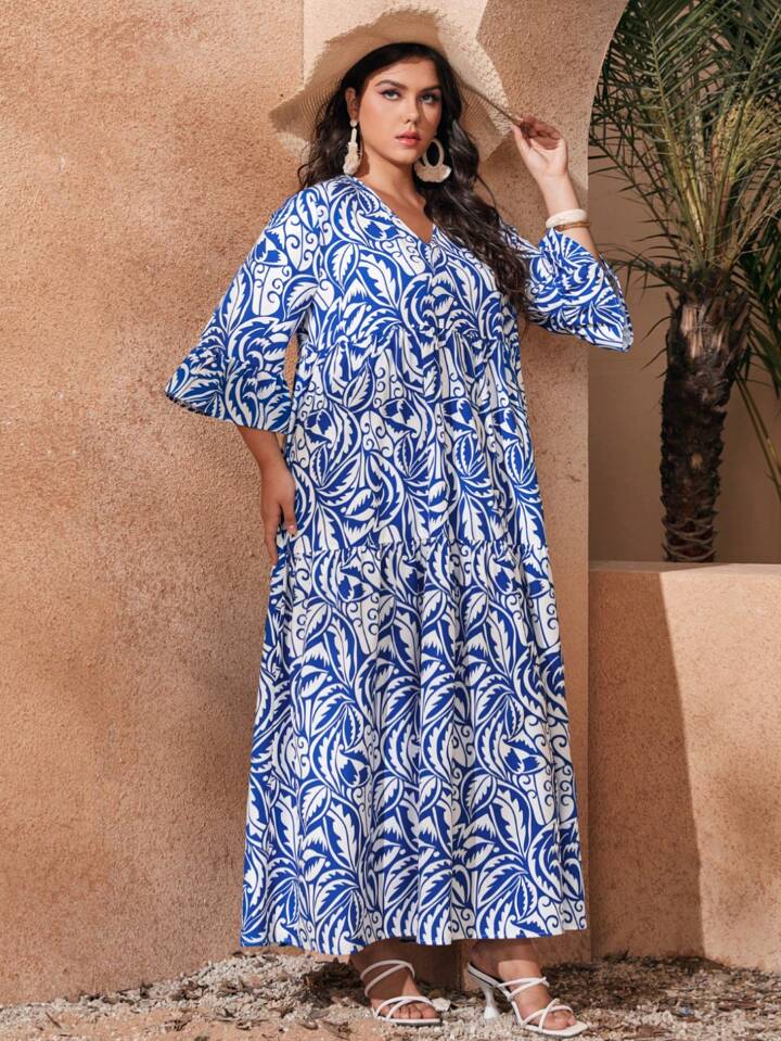 فستان سموك باكمام منتفضة وطباعة متكررة مقاس كبير