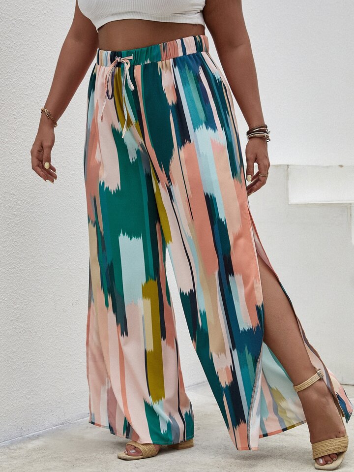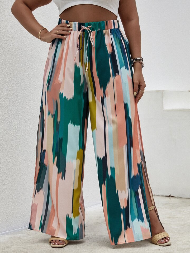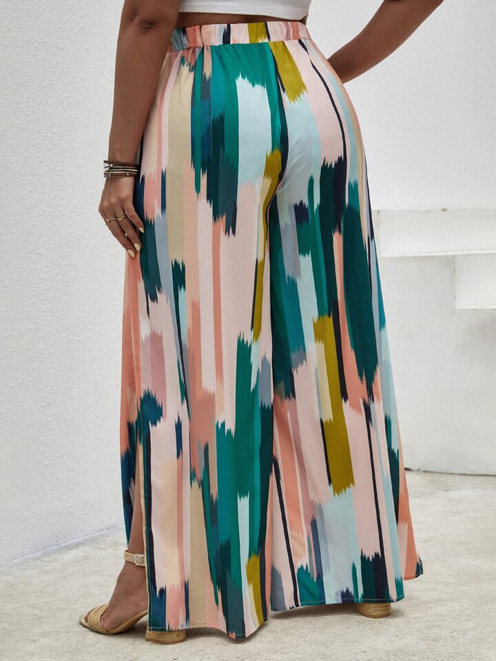 بنطلون بساق واسع بفتحة بطباعة شامل مقاس كبير