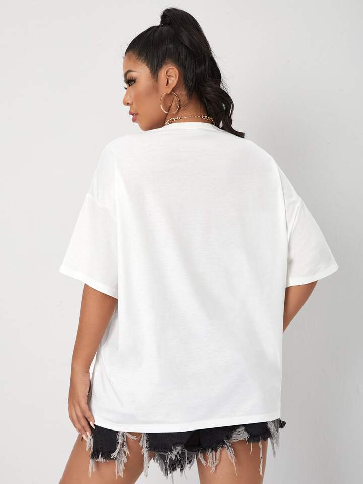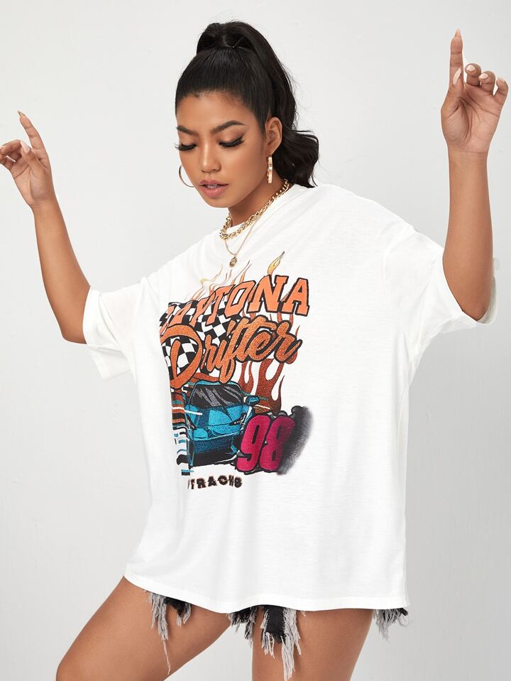 تي شيرت منخفض الاكتاف طباعة حروف وسيارة مقاس كبير Bikercore