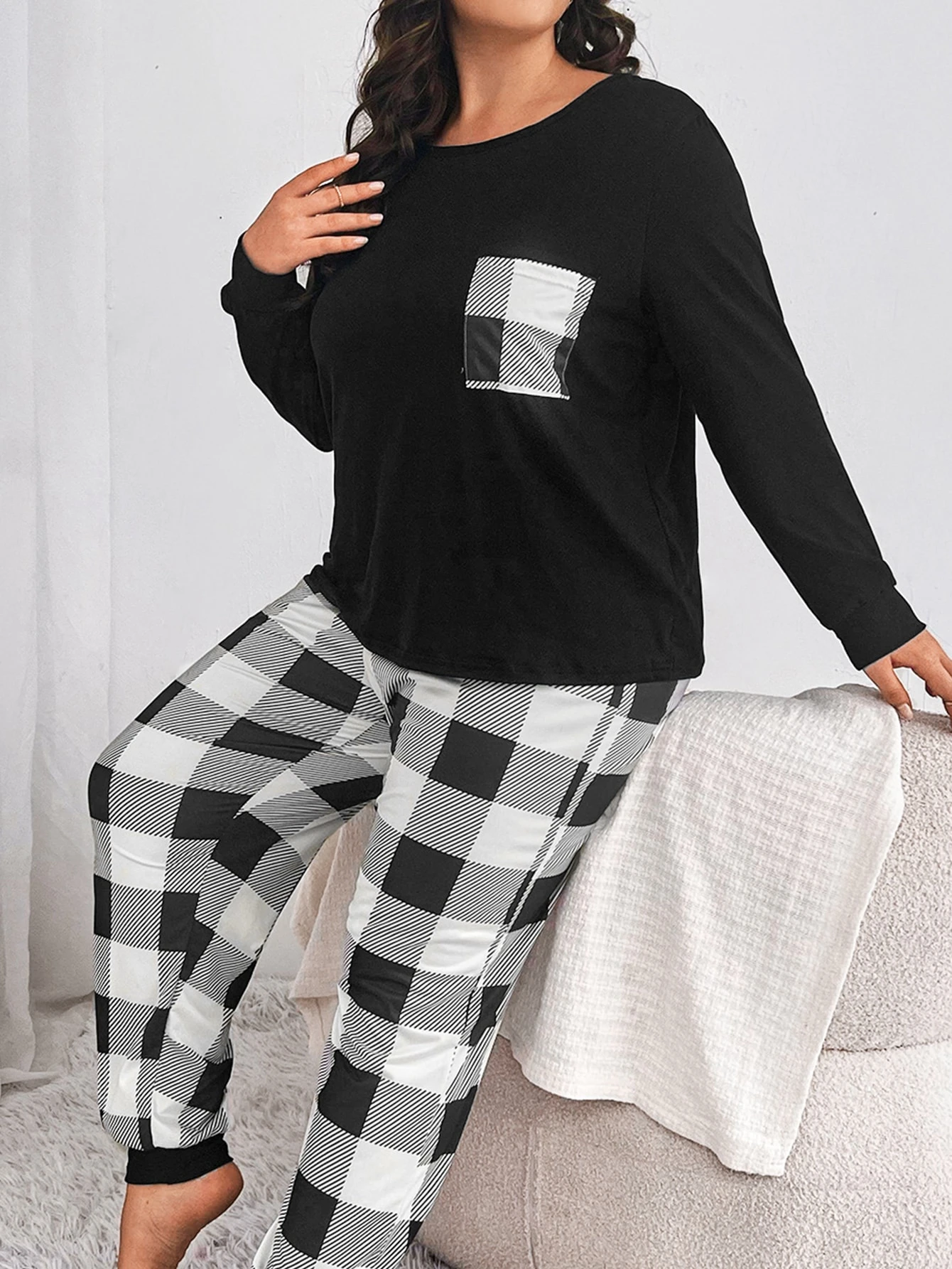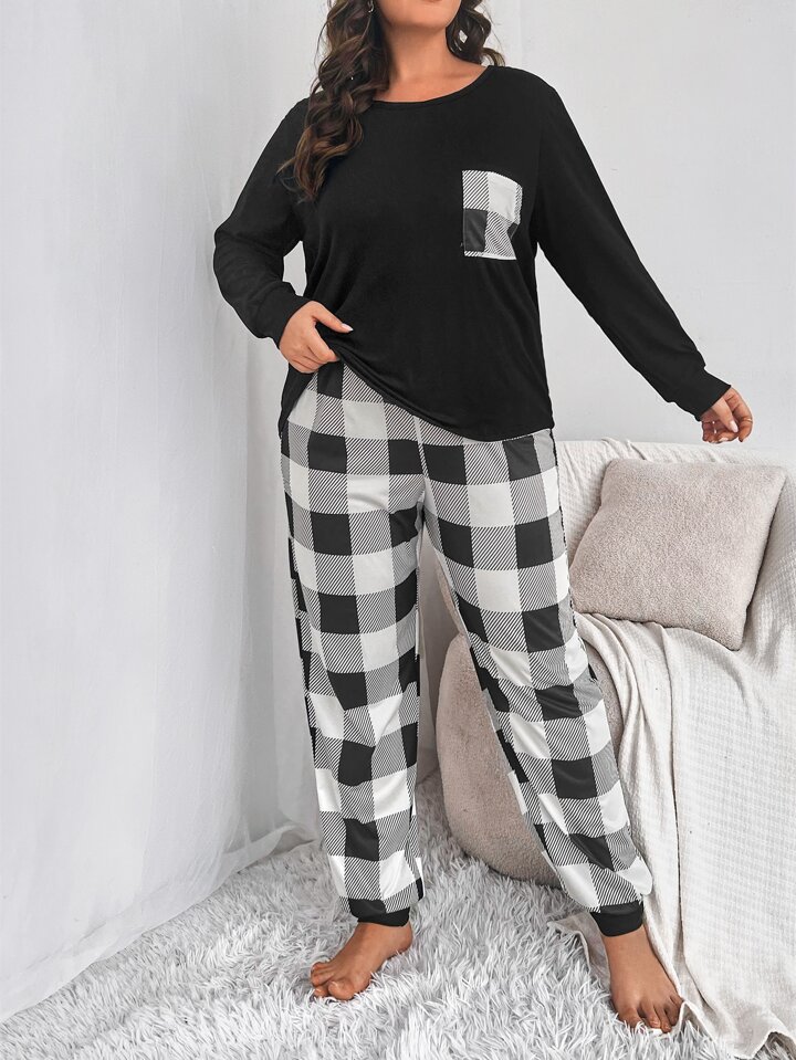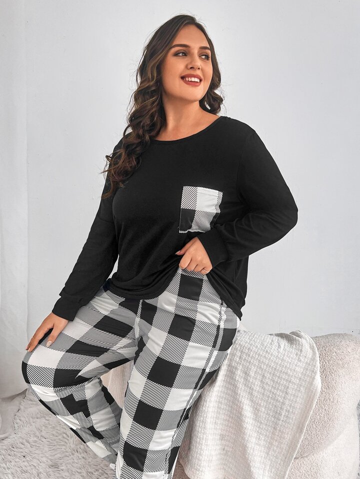 طقم بيجامة تي شيرت وبنطلون بطباعة مربع النقش جاموس جيب مرقع مقاس كبير