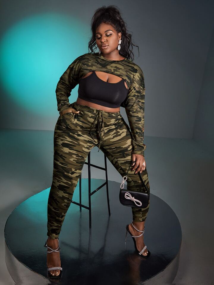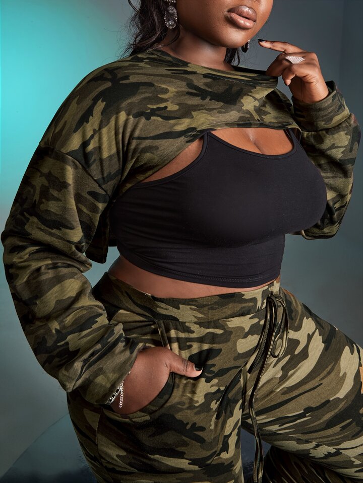 بلوفر طباعة مموه منخفض الاكتاف عالي ومنخفض بدون لباس علوي كامي مقاس كبير