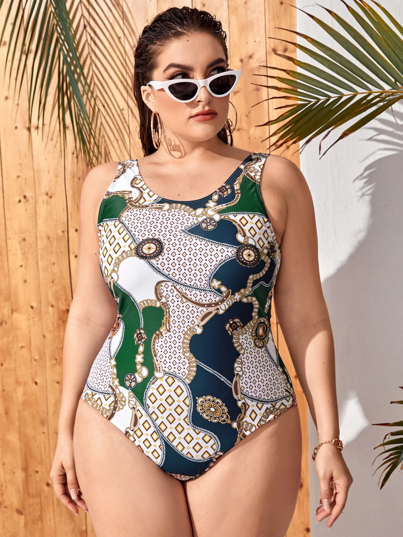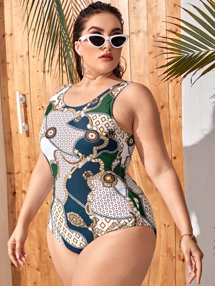 ملابس سباحة قطعه واحده مقاس كبير بطباعة جغرافي وسلسلة
