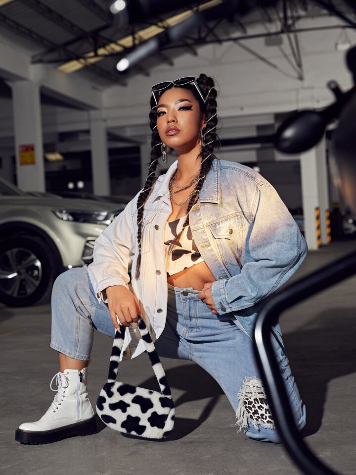 جاكيت دينيم بجيب رفرف بالوان متجانسة مقاس كبير