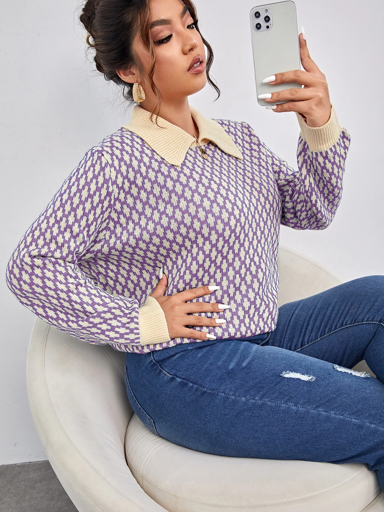 مقاس كبير كنزة صوف ياقة متباينة نمط هندسي