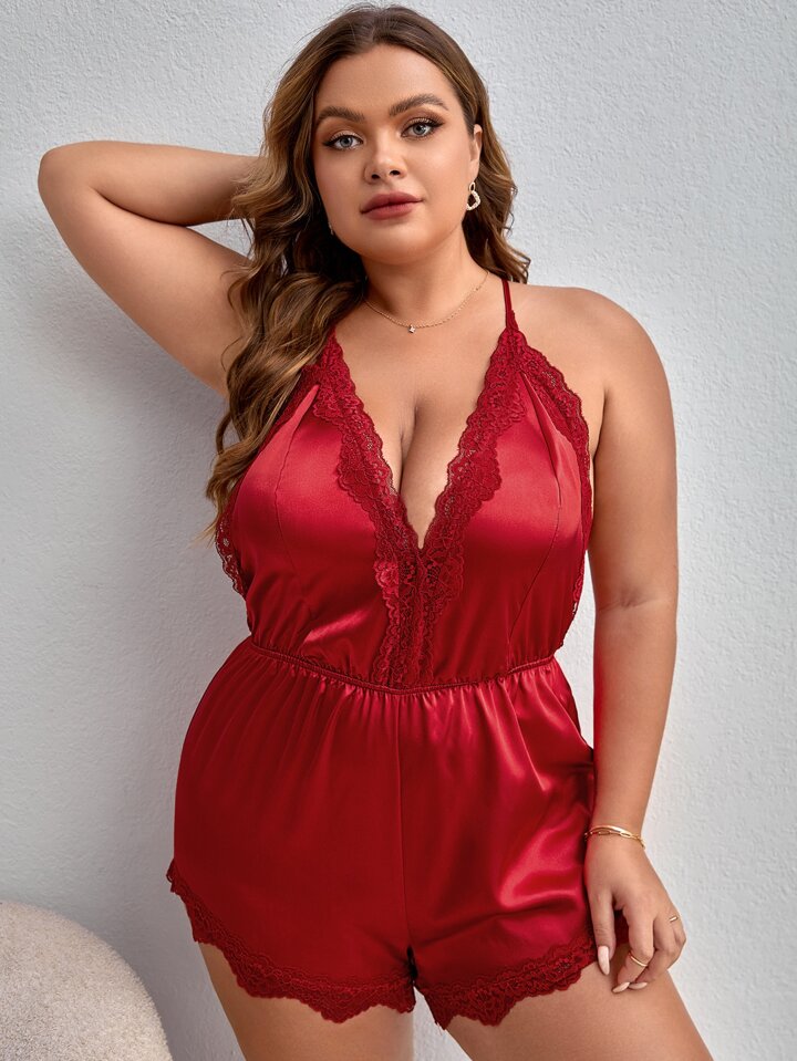 أوفر رومبر نوم من الساتان بظهر مكشوف وتداخل شريط الدانتيل بلس كونتراست