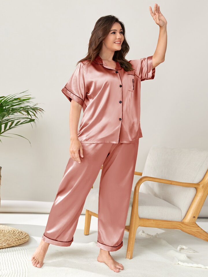 طقم بيجامة ساتان بشريط متباين مقاس كبير