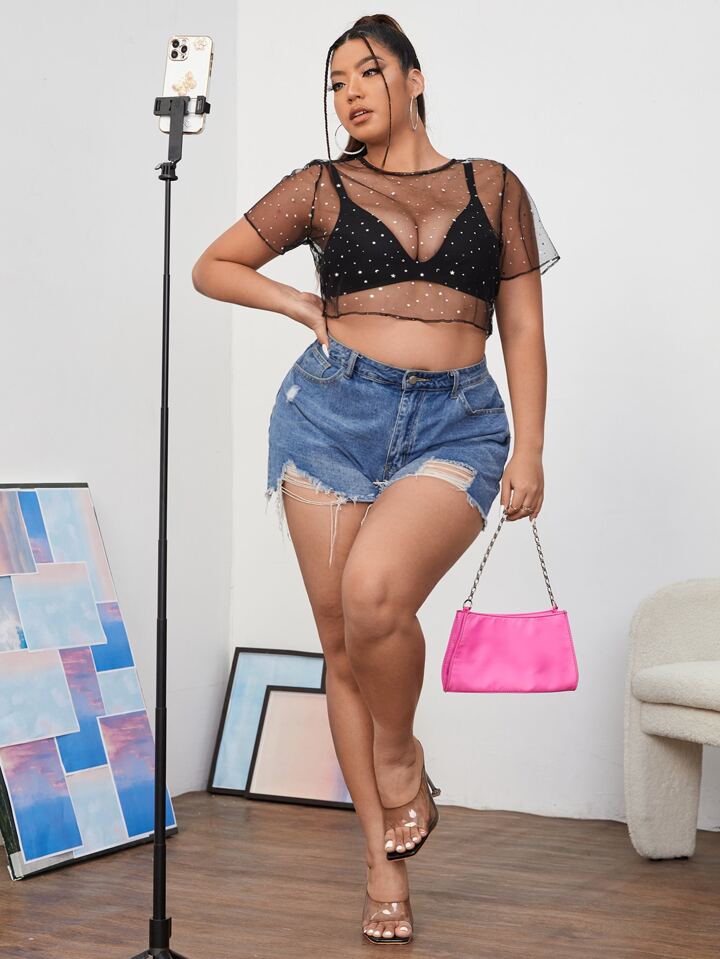 مقاس كبير لباس علوي ترتر متباين اللون قصير شبكي شفاف بدون حمالة صدر