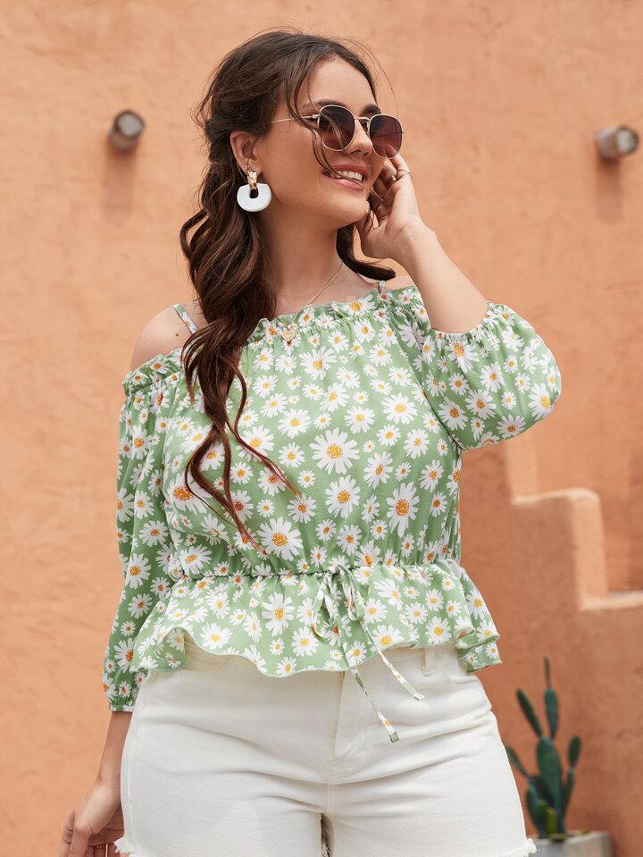 بلوزة بحافة مكشكش وبطباعة زهر اقحوان مقاس كبير