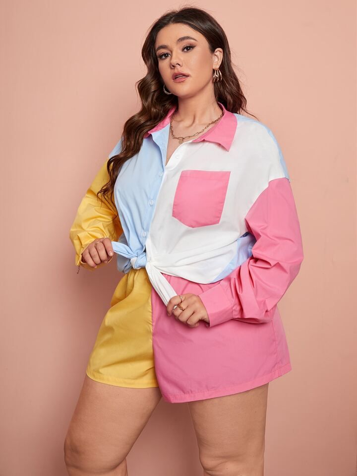 مقاس كبير منخفض الاكتاف ألوان متباينة بلوزة مع شورت طقم