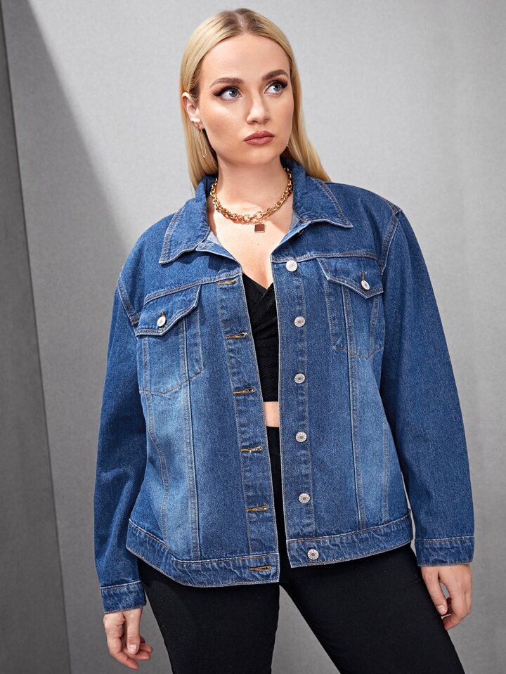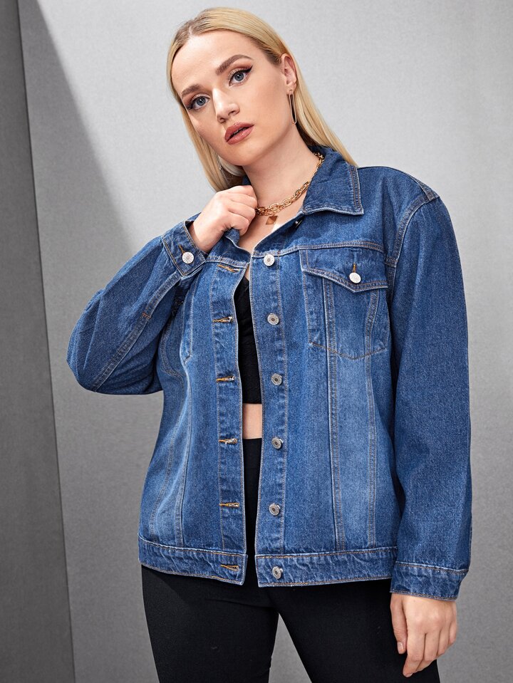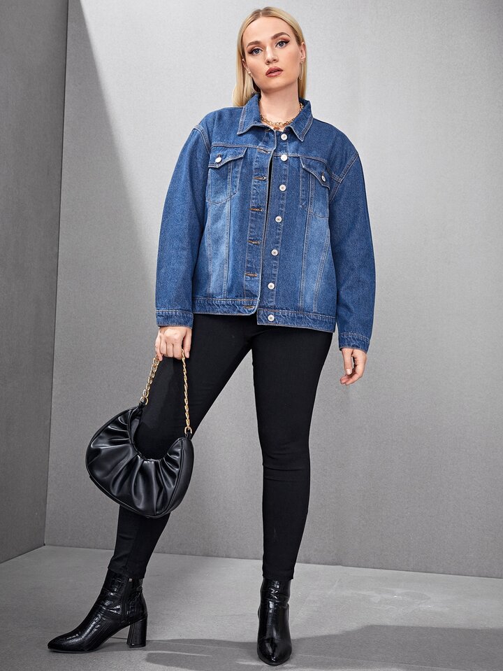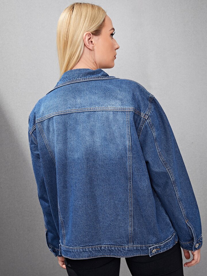 جاكيت جينز بتفاصيل رفرف ومنخفض الاكتاف مقاس كبير