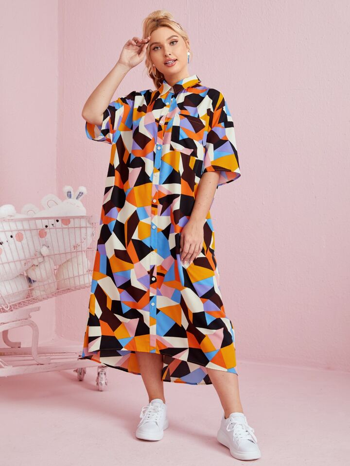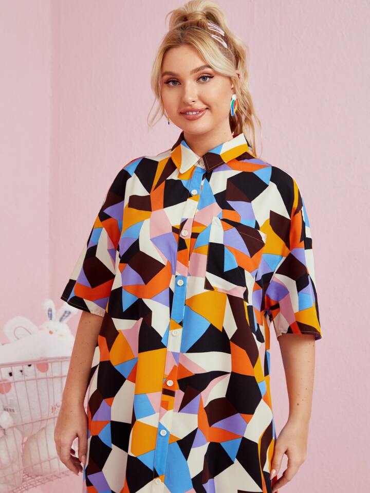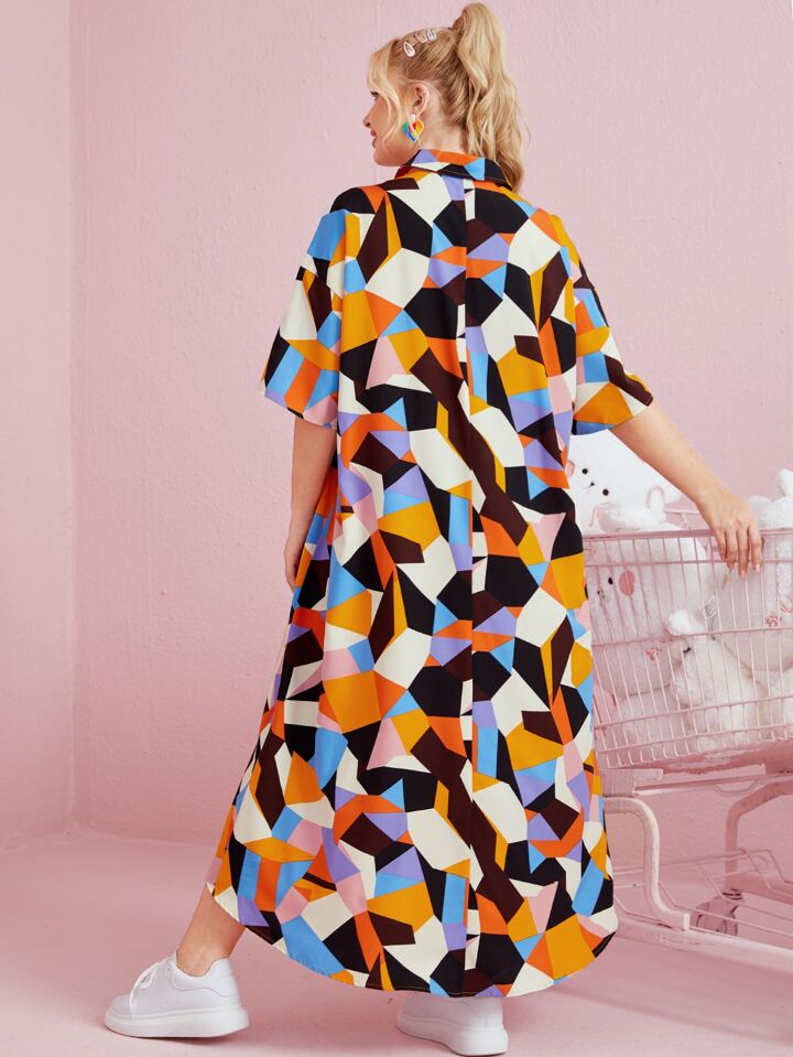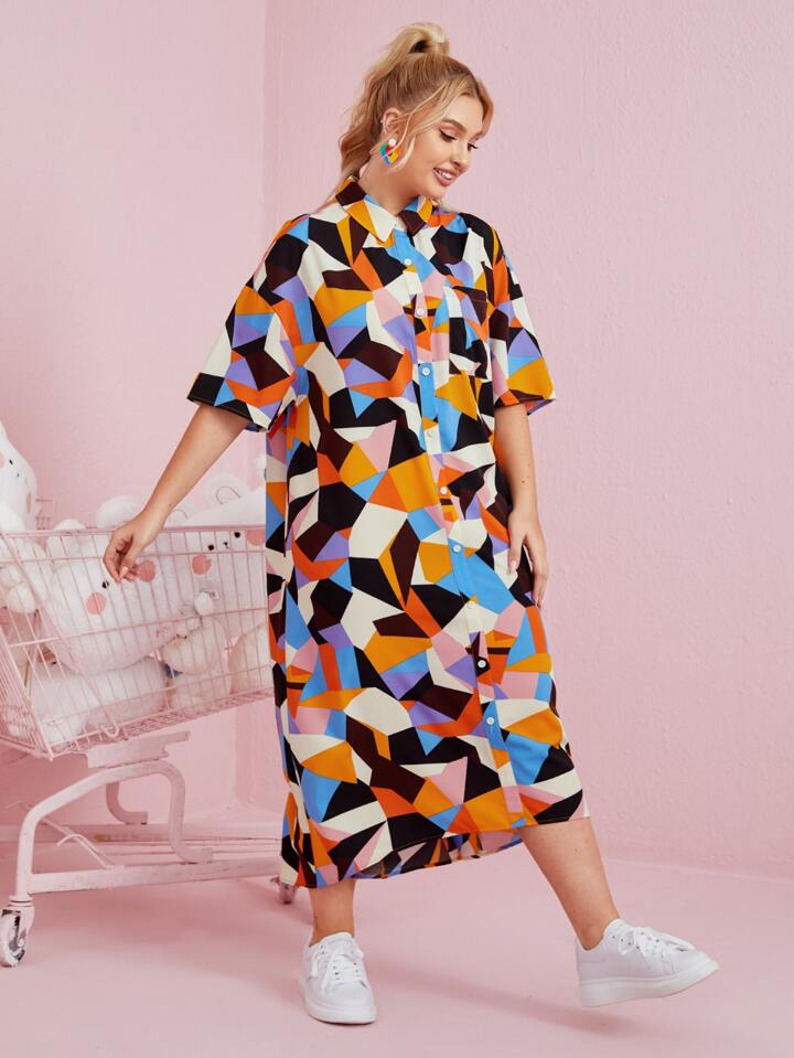 فستان قميص هندسي منخفض الكتف مقاس كبير