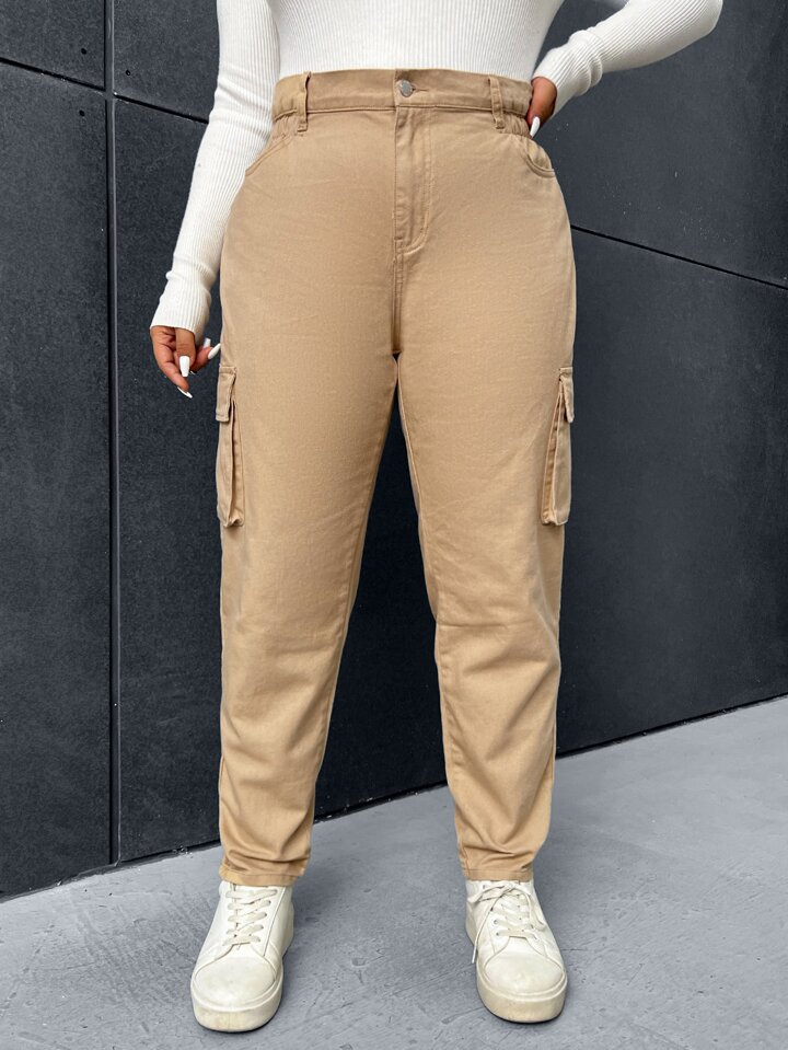 بنطلون جينز كارجو خصر عالي جيب جانبي قلاب مقاس كبير