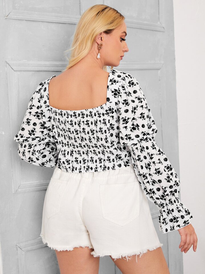 بلايز مقاسات كبيرة درز بربطة أمامية رسم الزهر بطباعة شاملة بوهو