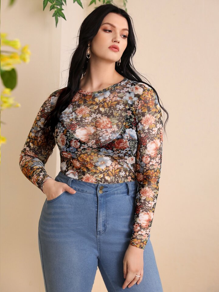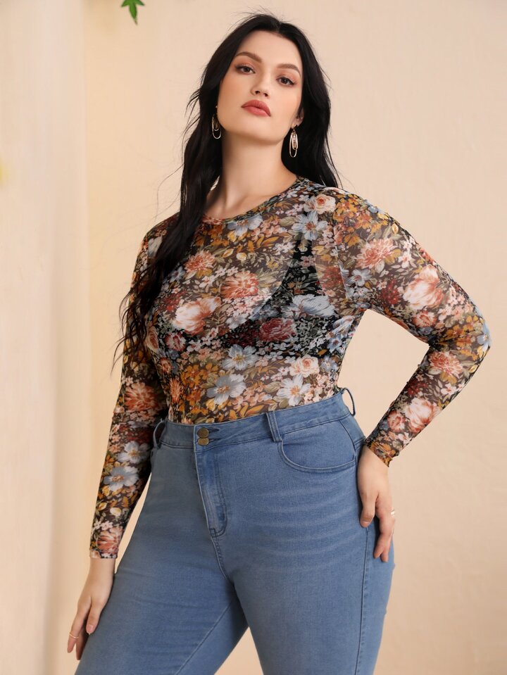 مقاس كبير ملابس علوية طباعة الأزهار شبكة
