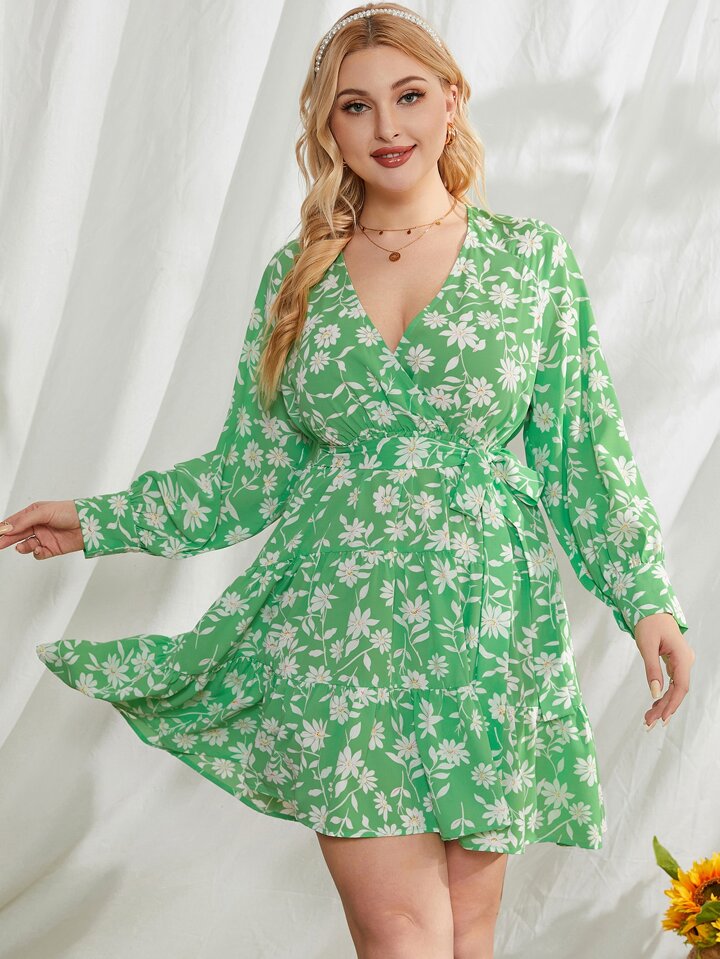 مقاس كبير فستان بحزام طباعة الأزهار عنق متداخل حافة مكشكشة