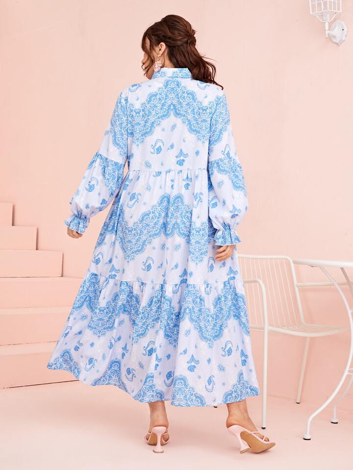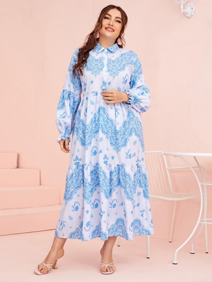 فستان قميص بطباعة أزهار وباكمام منتفضة مقاس كبير
