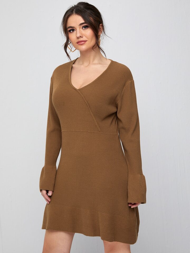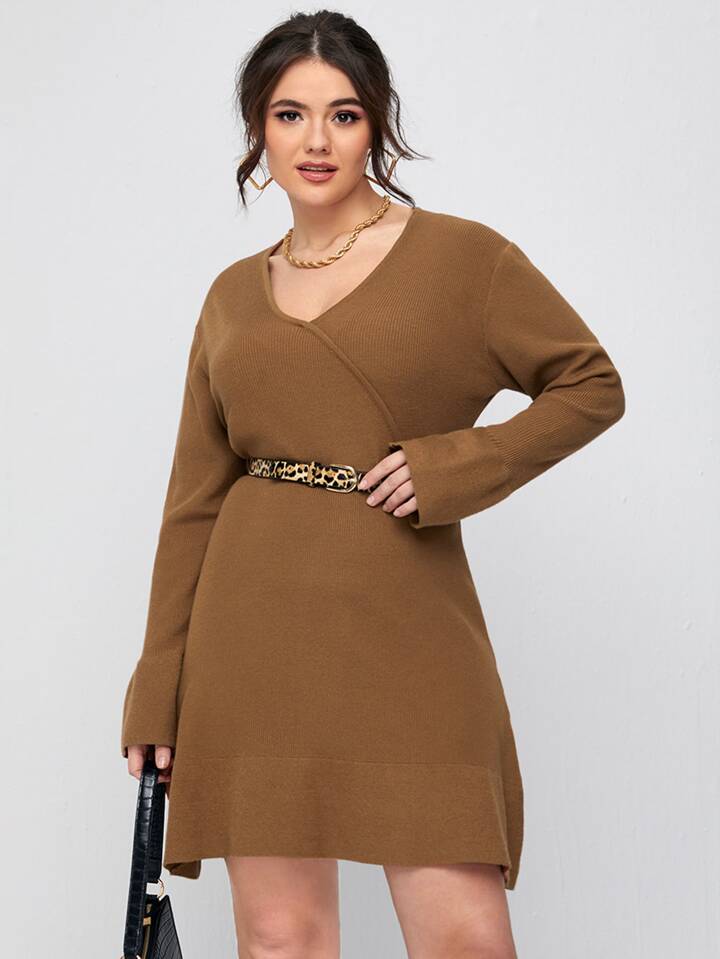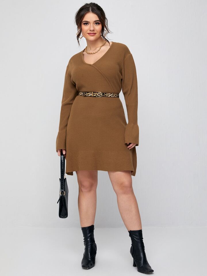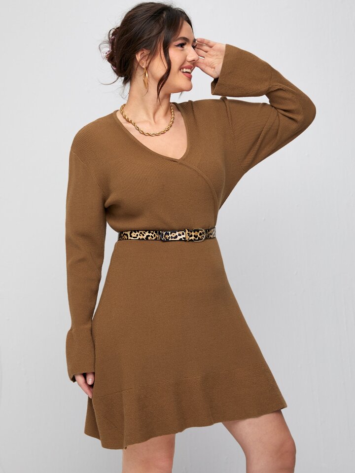 فستان صوف بأكمام مكشكش مقاس كبير بدون حزام