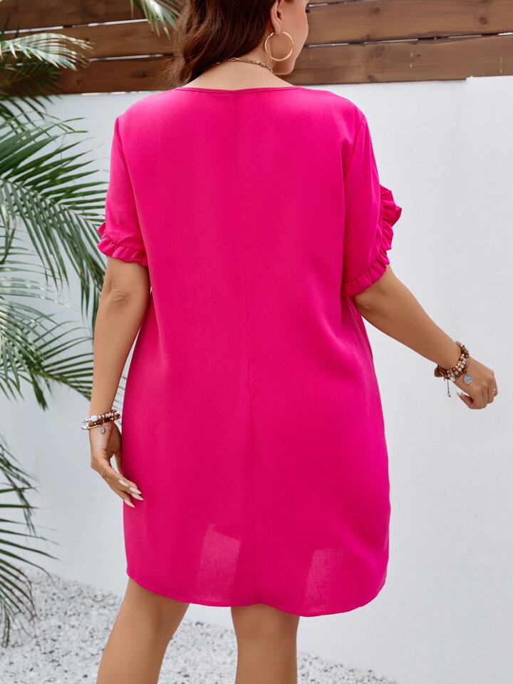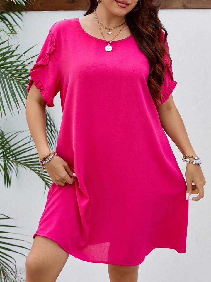 فستان بتصميم قصير وأكمام بتصميم الزهور، مزينة بتقويرة، للمقاسات الكبيرة