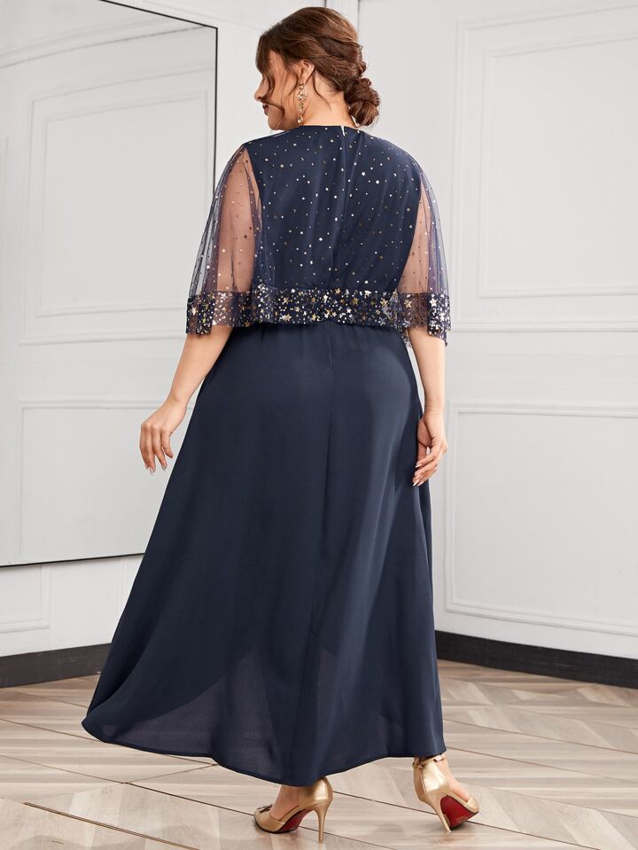 فستان حفلة بحافة منخفض وعالي بغطئ شبكي وبطباعة المجرة مقاس كبير