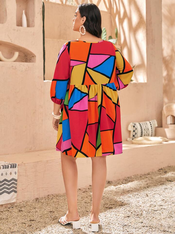 فستان بيبيدول طباعة هندسية أكمام فانوس مقاس كبير