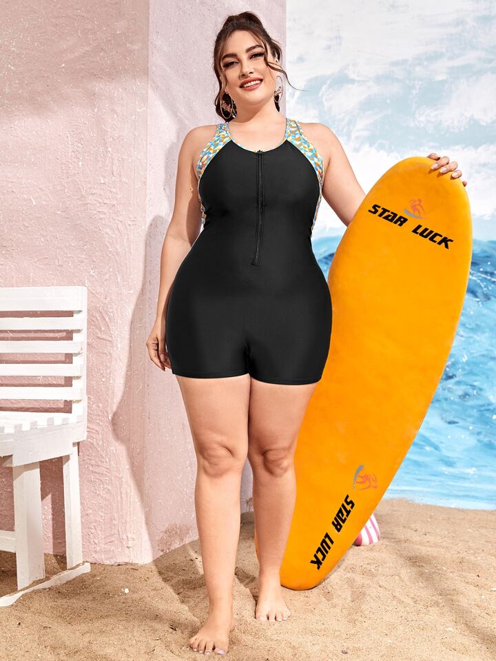 بذلة سباحة قطعة واحدة مطبوعة بنمط هندسي وبسحاب أمامي، للصيف والعطلات الشاطئية