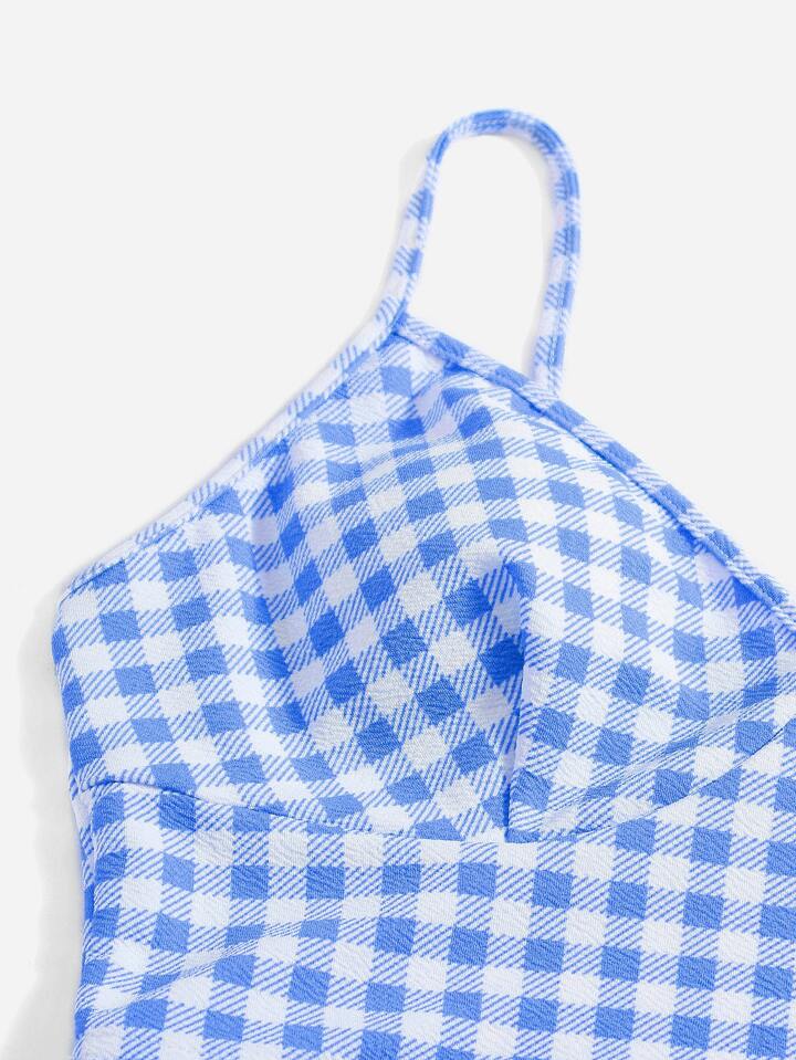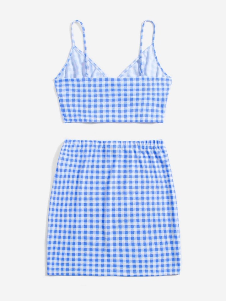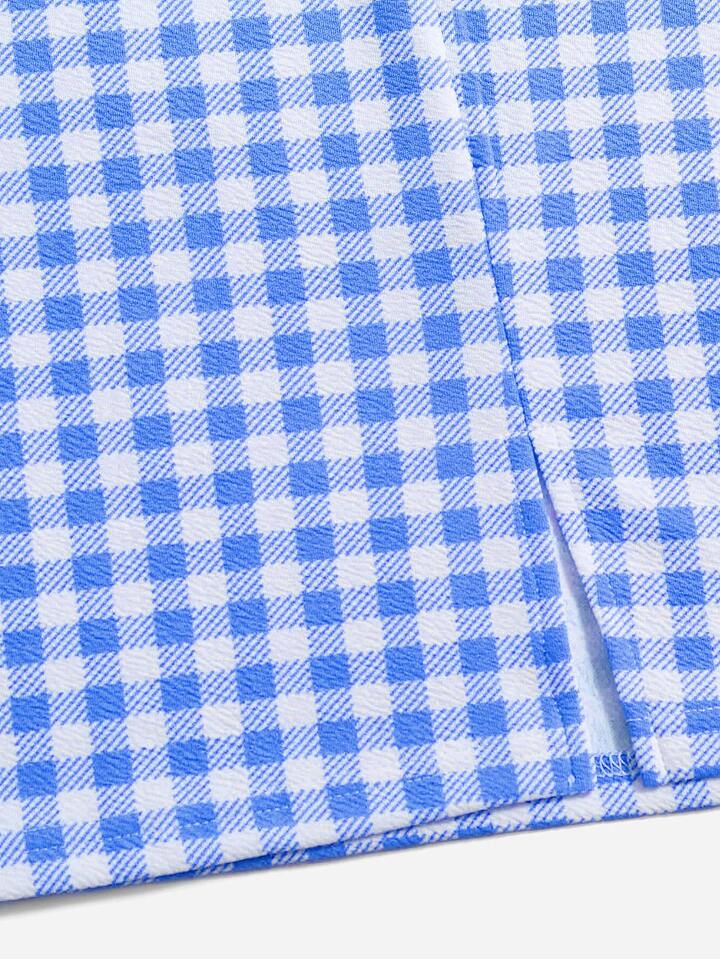 مقاس كبير بطباعة مربعات غنغهام بوستير لباس علوي كامي قصير مع فتحة طقم تنورة