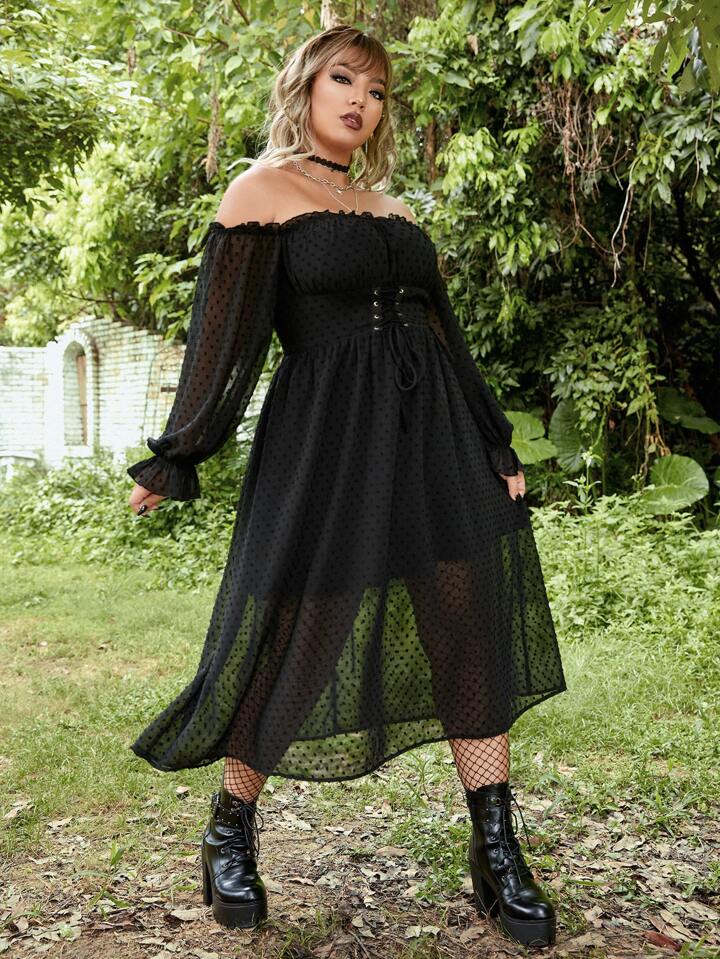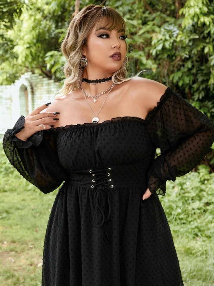 فستان موسيقى الروك المنحطة مكشوف الكتف عروة رباط اكمام منتفضة مقاس كبير