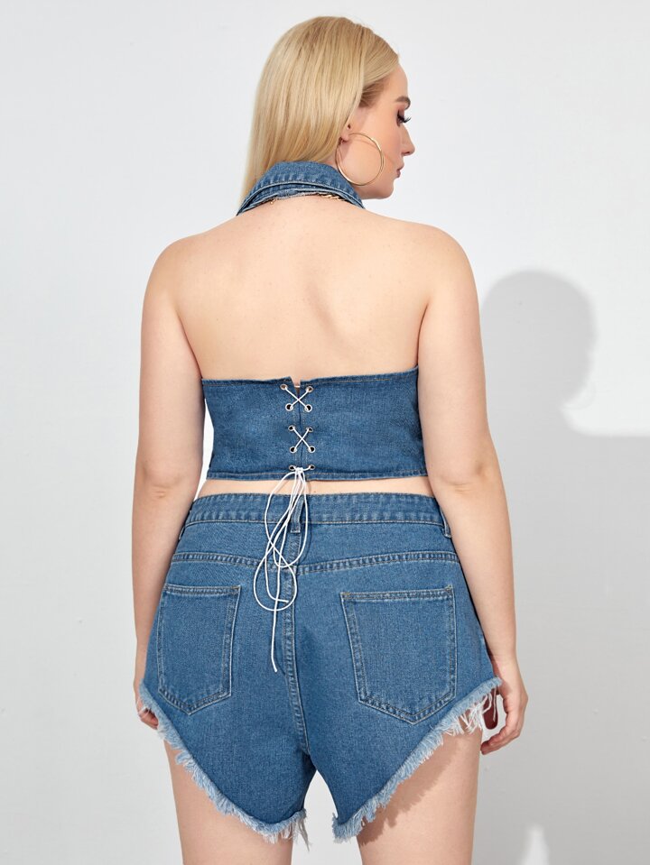طقم شورت مع لباس علوي جينز برباط وبرسن عنق مقاس كبير