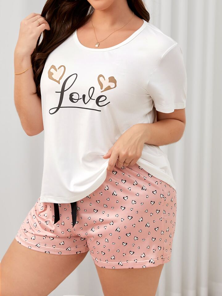 طقم بيجامة بجرافيك القلب وعبارة مقاس كبير