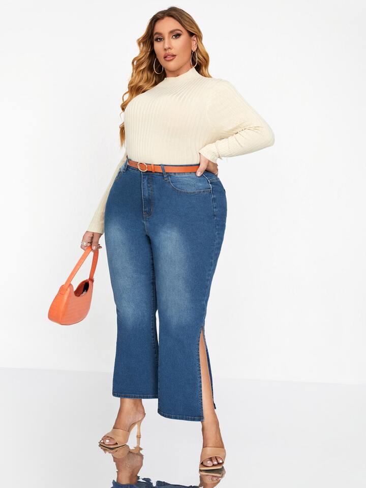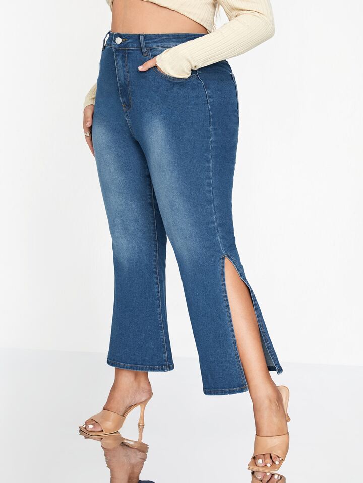 مقاس كبير بنطلون جينز خصر عالي باهت اللون بحافة شق