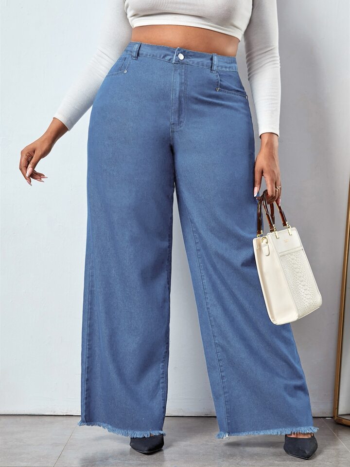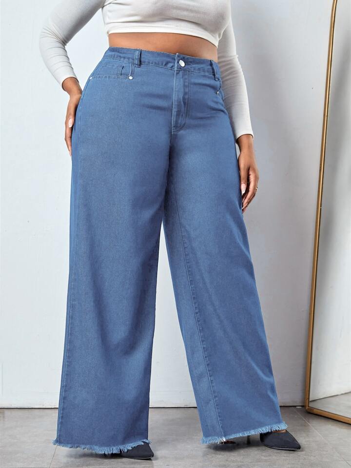 بنطلون جينز خصر عالي حافة خام ساق عريضة مقاس كبير