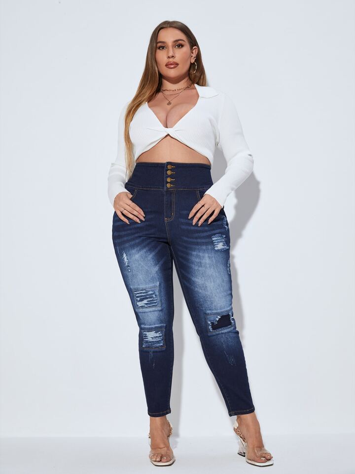 بنطلون جينز نحيل خصر عالي ممزق مهتري الحواف مقاس كبير